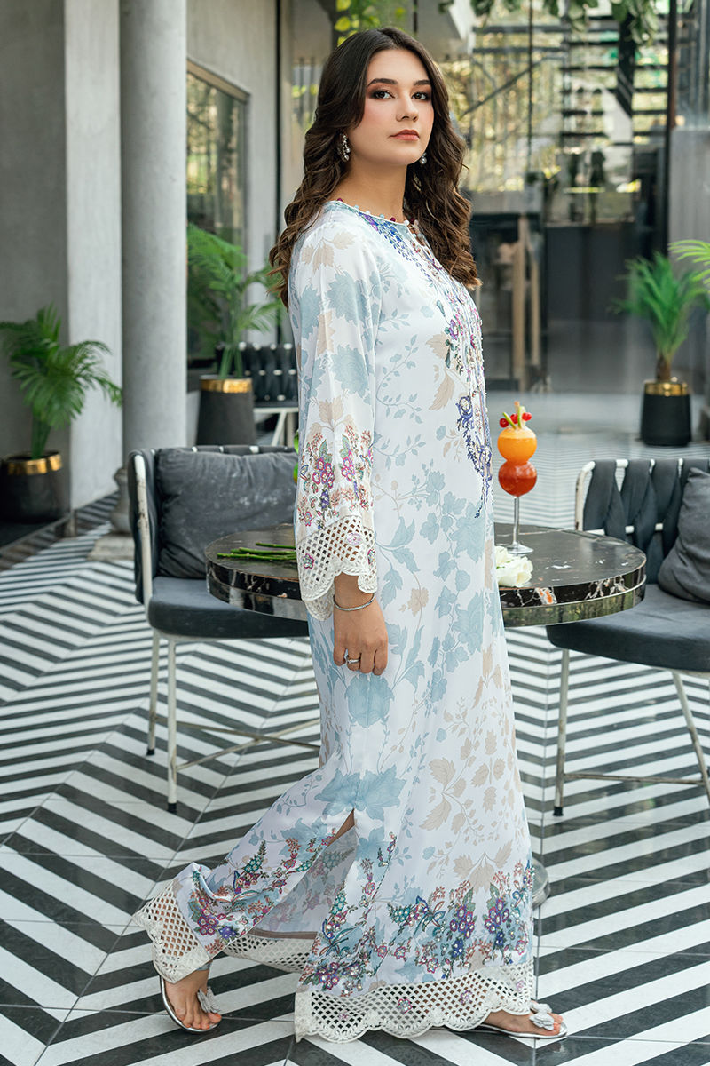 This elegant kaftan is crafted on a soft ivory-white base, delicately adorned with a high-definition digital floral print in soothing tones of powder blue, soft aqua, muted teal, lavender, lilac, blush pink, and warm beige. The balanced color palette creates a fresh, airy, and refined look, perfect for graceful daytime wear.
