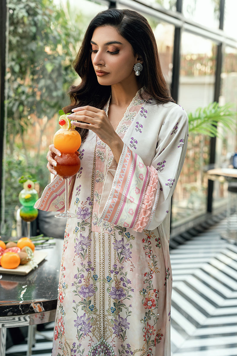 This elegant kaftan is crafted in a soft ivory-cream base, adorned with a refined digital floral print in delicate hues of lavender, blush pink, soft peach, and muted green. The silhouette is fluid and graceful, designed to drape effortlessly while maintaining a polished, elongated look.