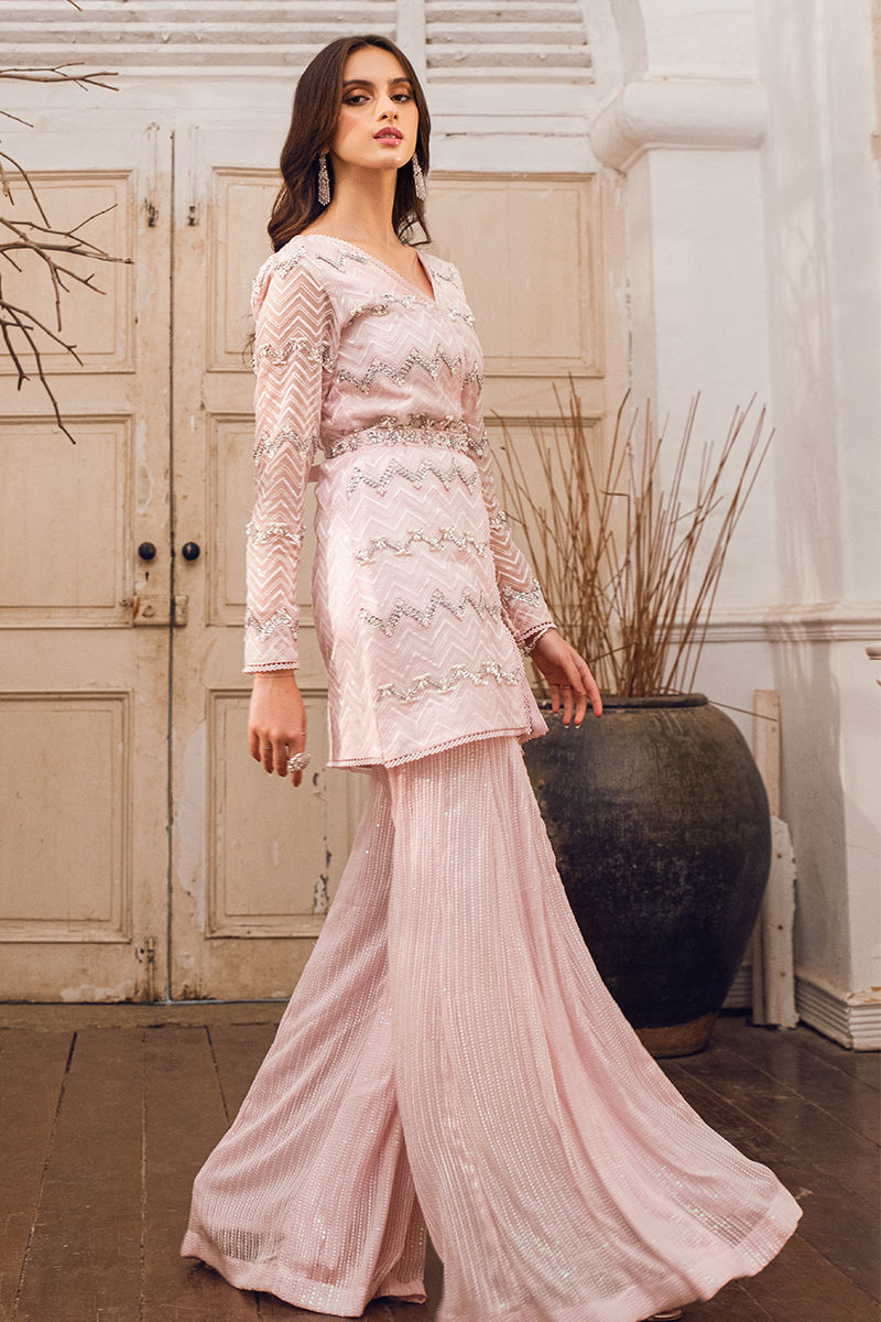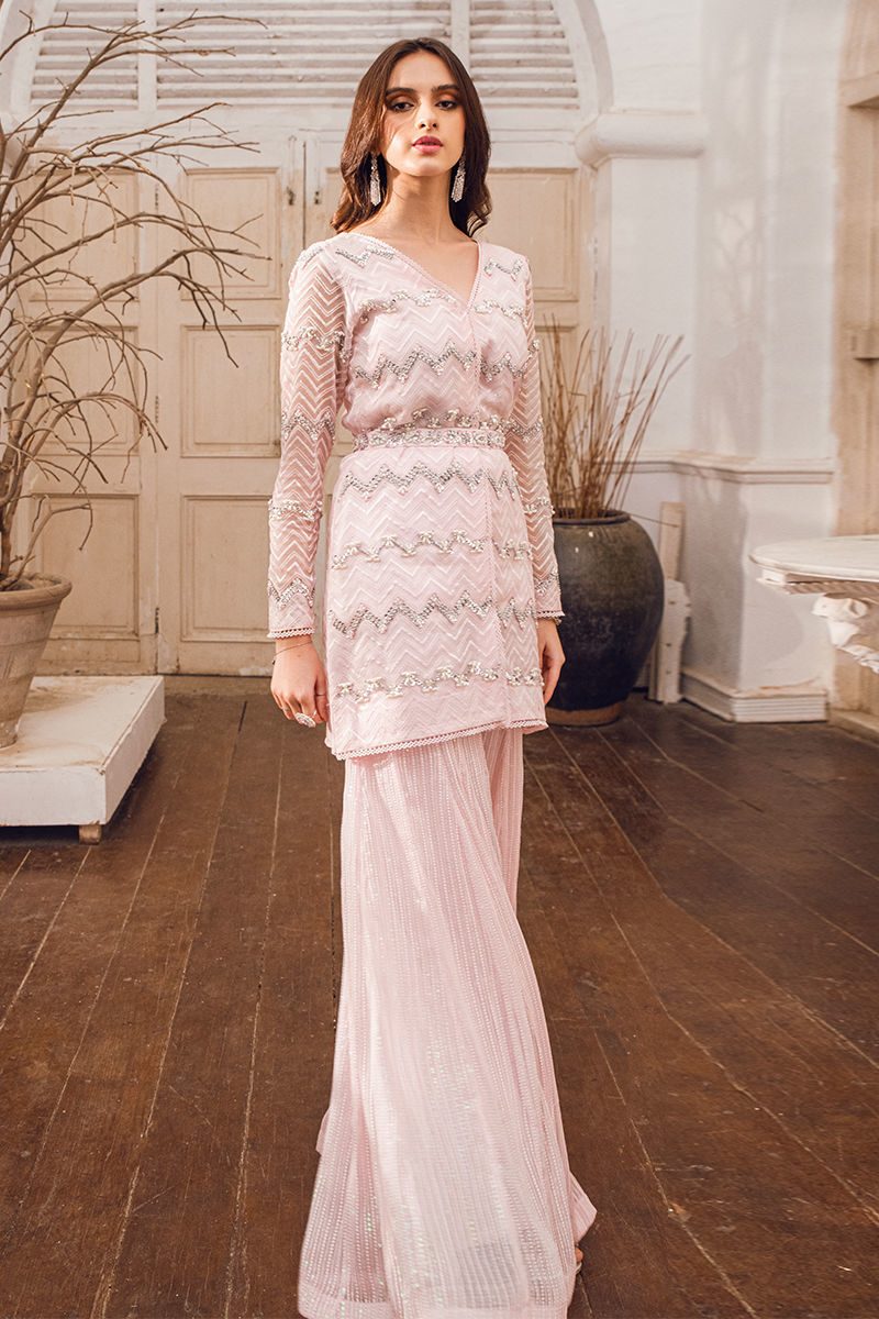 Enhance your style with a front-open shirt and flair pants in pink hues, adorned with sophisticated handwork and lace detailing. Complete the look with pants for a touch of drama and perfection