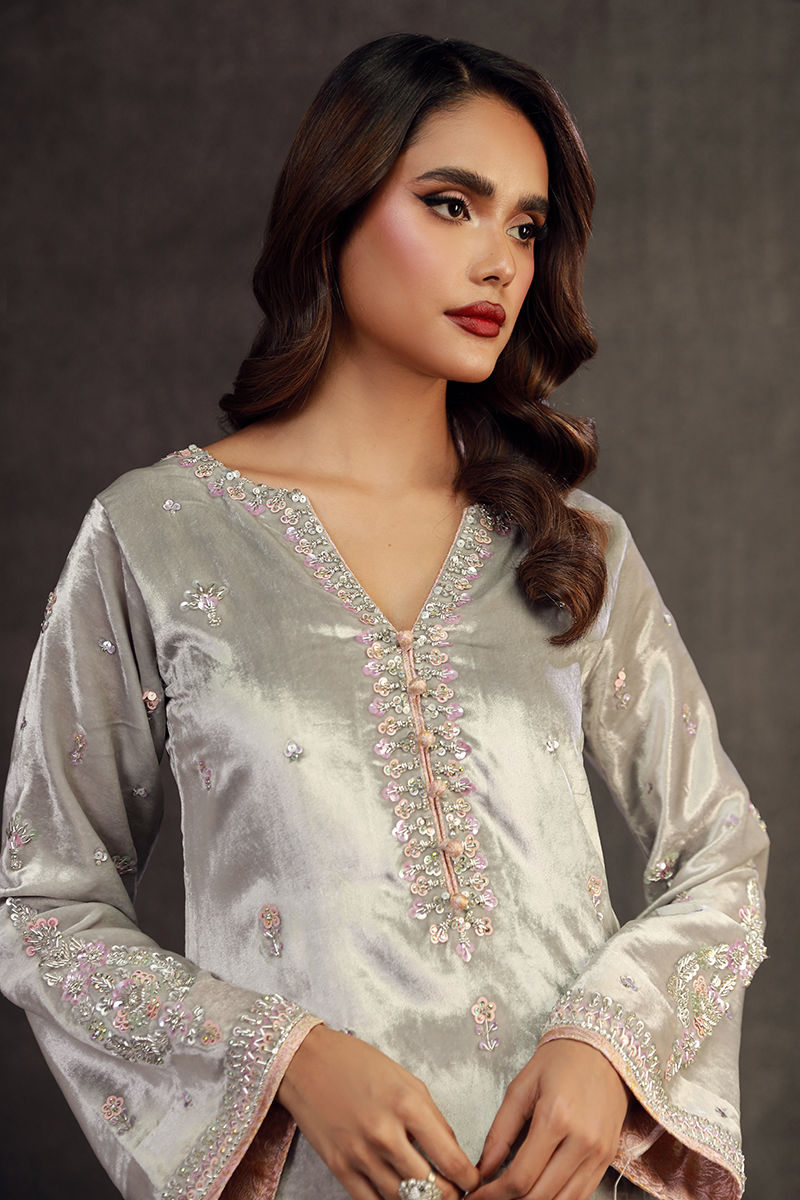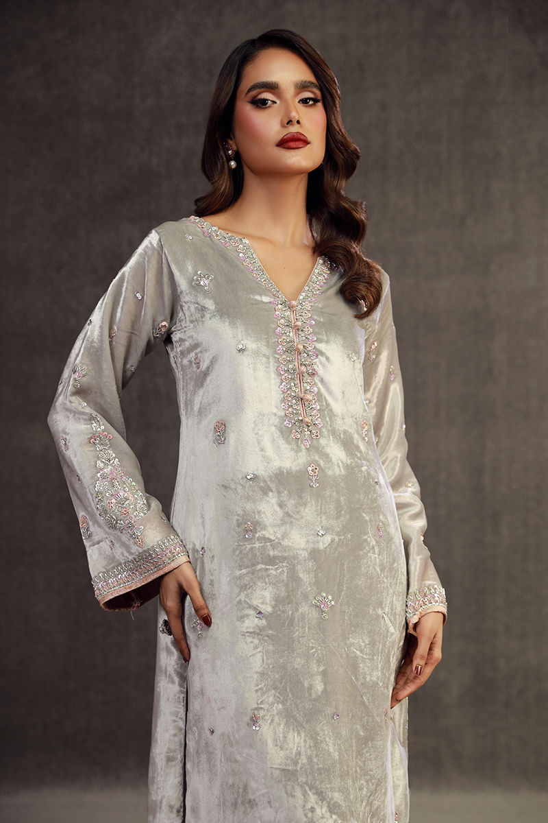 Color: Silver Grey Fabric: Velvet Work Details: Embellished And Embroided