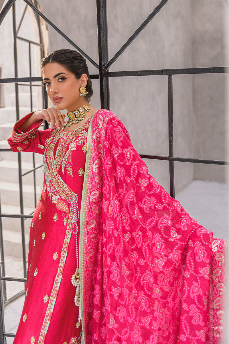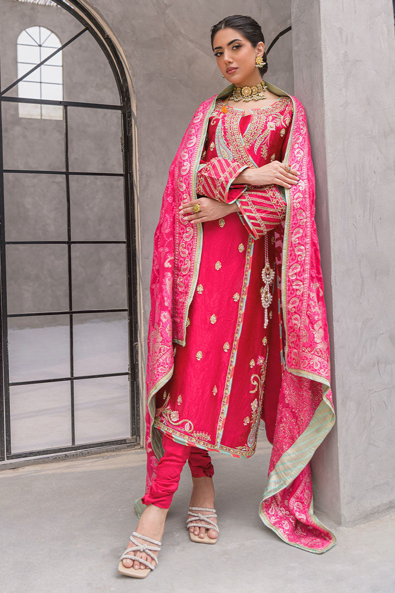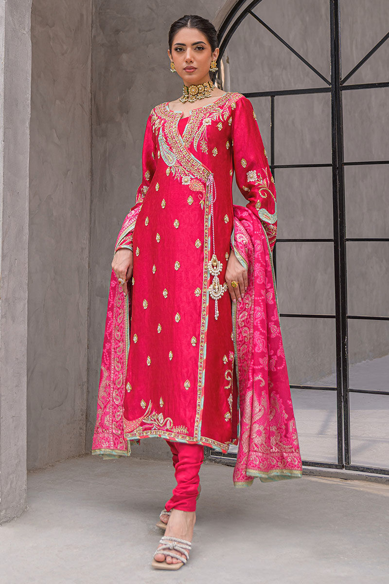 A majestic crimson long kameez paired with churidar trousers and a dupatta, embodying heritage with modern finesse. The ensemble features exquisite resham embroidery, sequins, and zardozi handwork in shades of gold and mint, delicately placed over a jewel-toned canvas. The dupatta carries traditional motifs with a zari border, adding a regal charm. Perfect for formal occasions and festive gatherings, this design reflects royal sophistication.