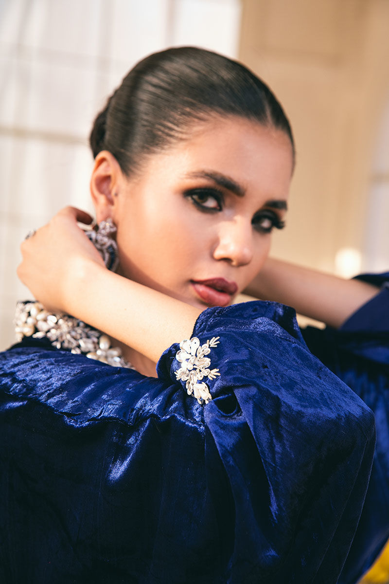 The sumptuous deep blue kaftan exudes glamour with its plush velvet fabric and intricate hand embellishments along the neckline and stunning motifs. It's a perfect choice for any festive occasion this season. To complete the look, pair it with your favorite shoes and statement earrings for a head-turning and stylish ensemble.