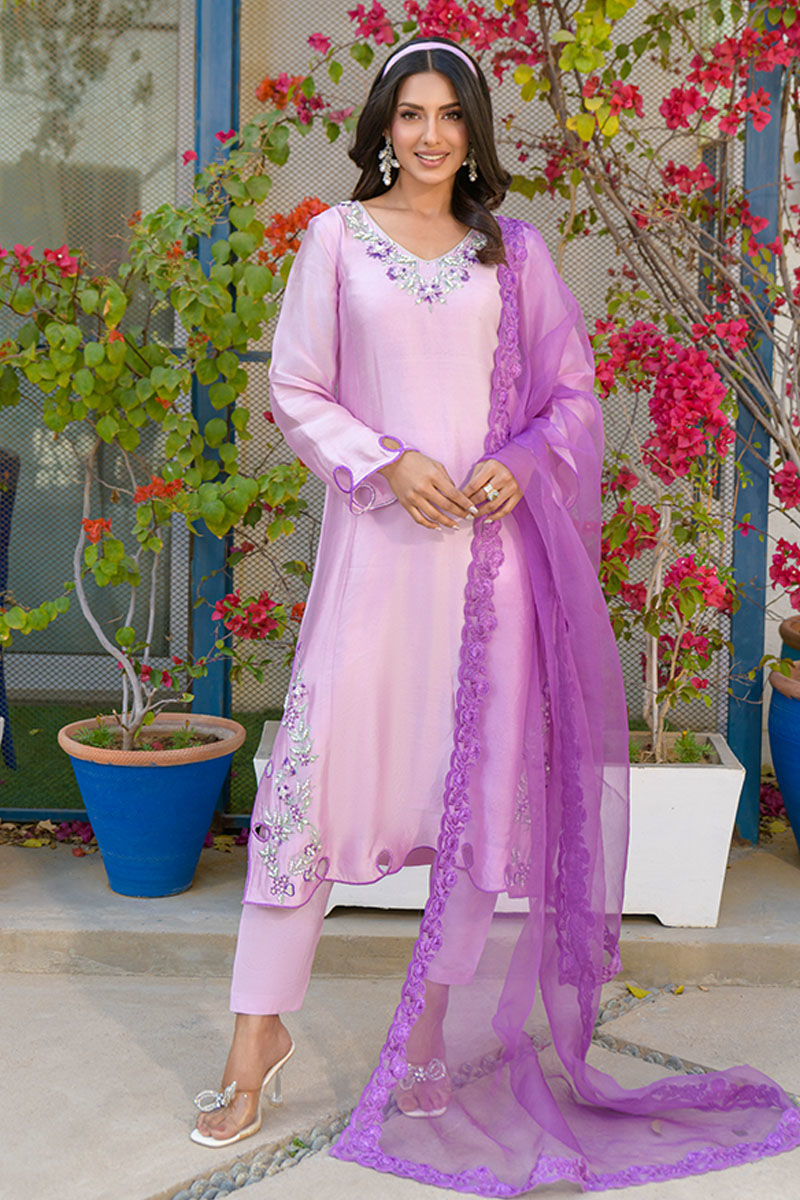 This beautiful article features a pure sheesha silk lavender colored a-line shirt with an embroidered and embellished neckline and chokes with 3d flowers and cutwork borders all finished with cotton silk straight pants and cutwork organza contrasting dupatta.