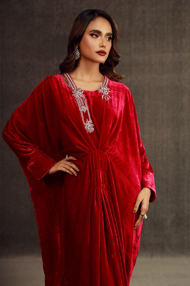This elegant article features a vibrant pink kaftan with and asymmetrical neckline which is embroidered and embellished with silver zari and pearls finished with a side slit.