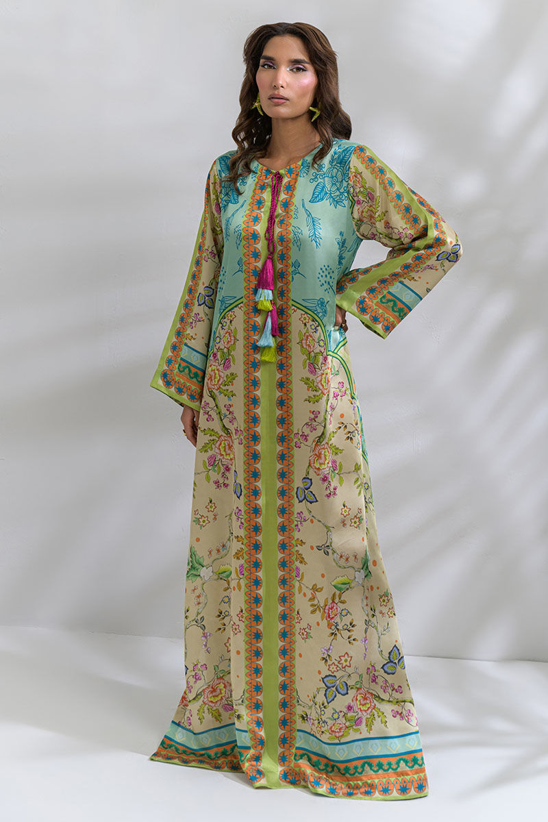 Embrace a more sophisticated style with this elegant breathable shamooz silk kaftan, featuring a beige and light blue and chartreuse color palette. This is a long ankle-length kaftan with flowy sleeves which is finished with a contrasting tassel details on the neckline which makes it perfect for your summer affairs.