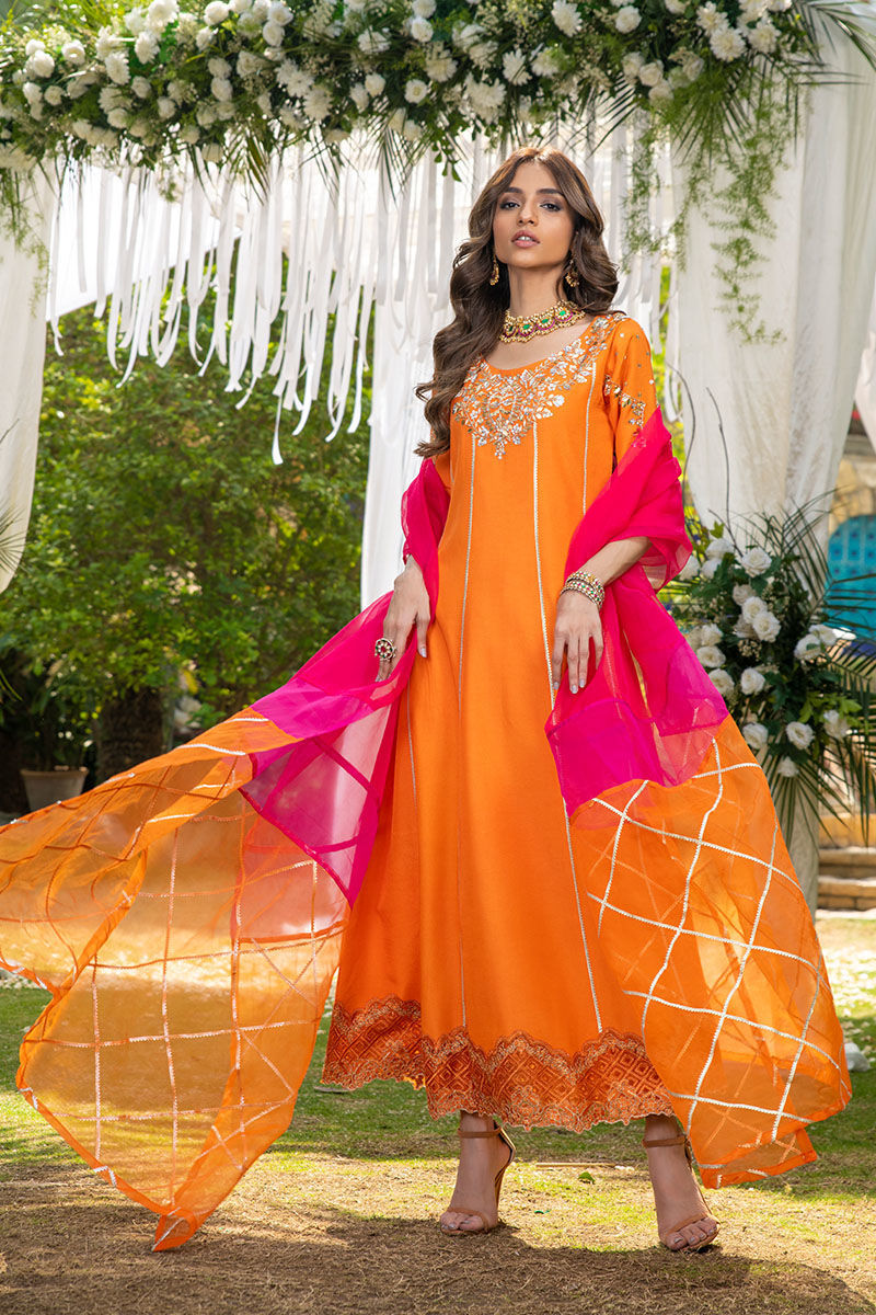 A stunning burnt orange kalidar adorned with delicate traditional handwork, exuding elegance and grace. Elevate your style with this daintily embellished masterpiece, a perfect blend of classic charm and contemporary fashion.