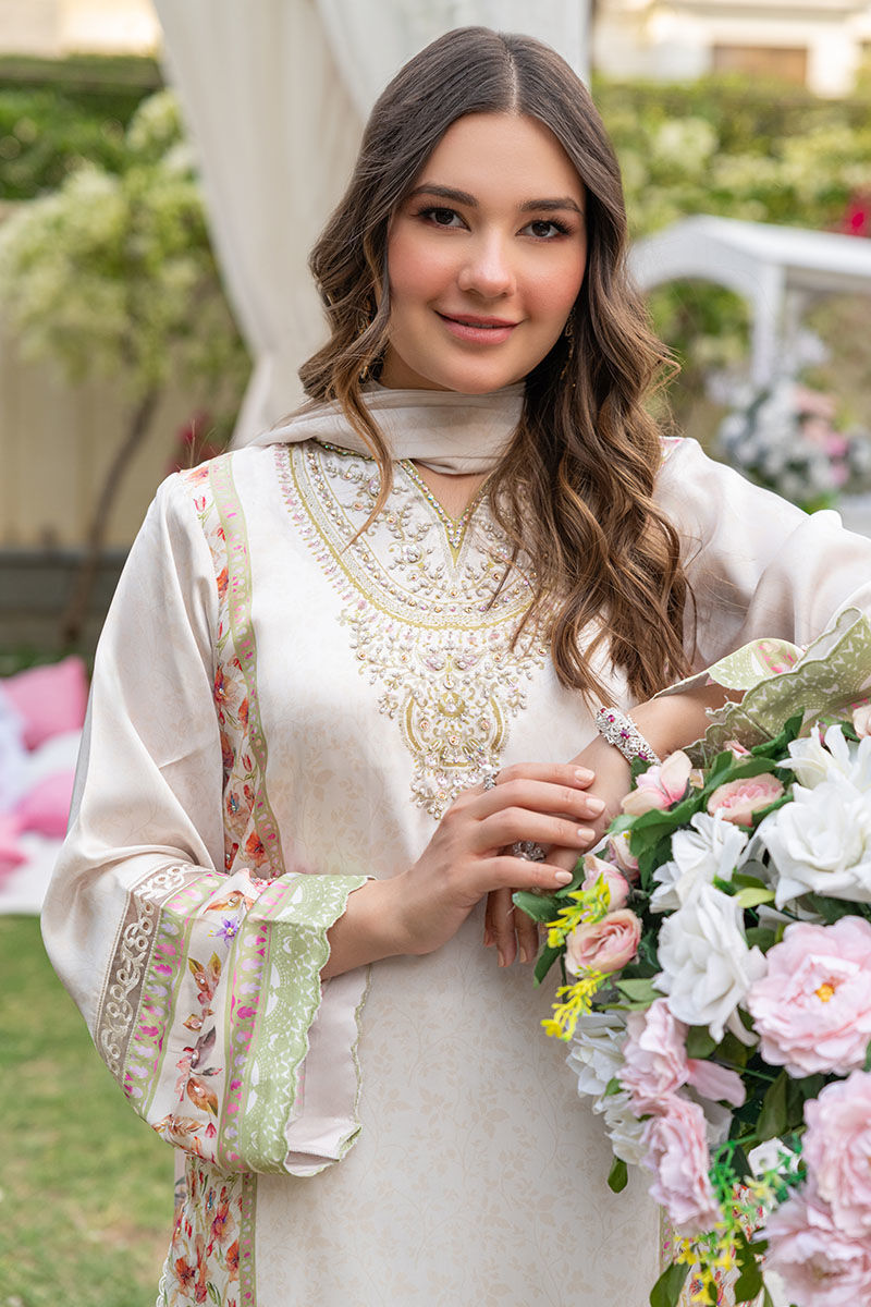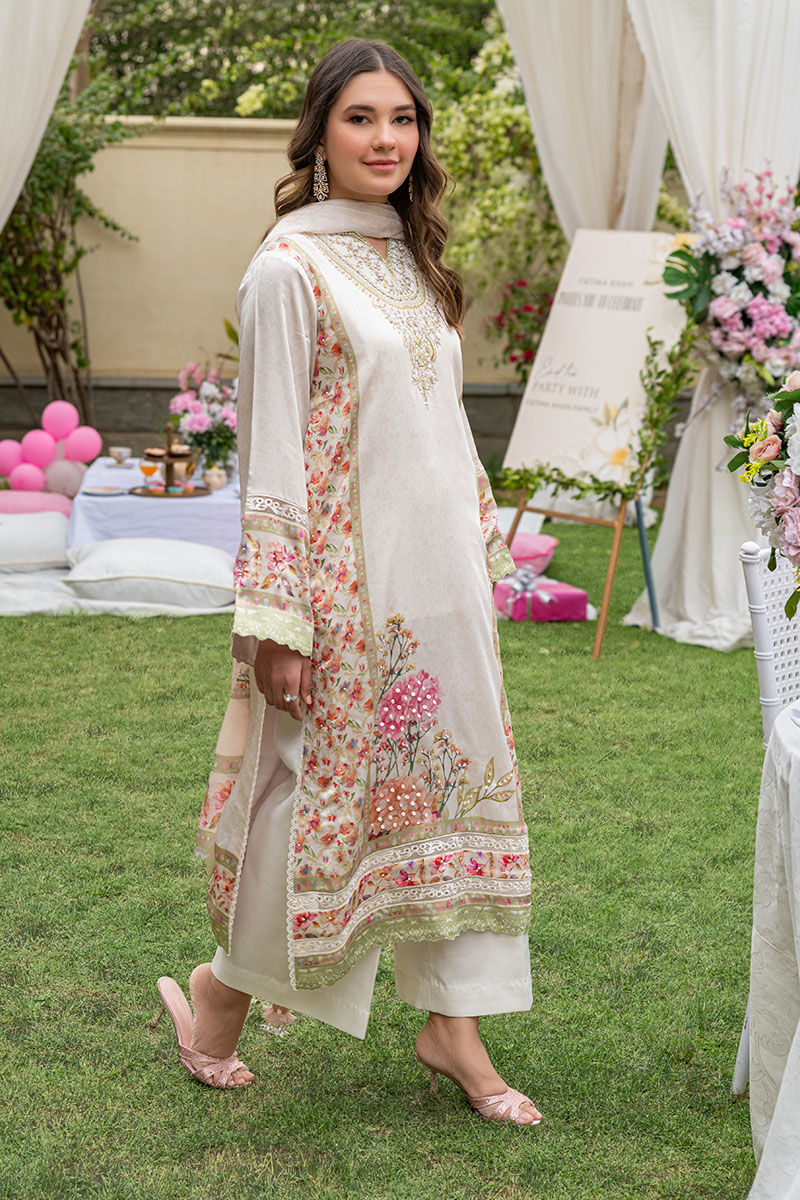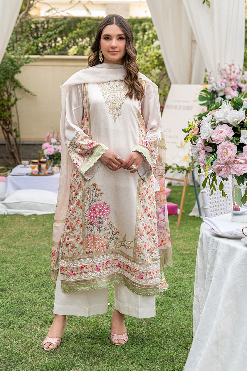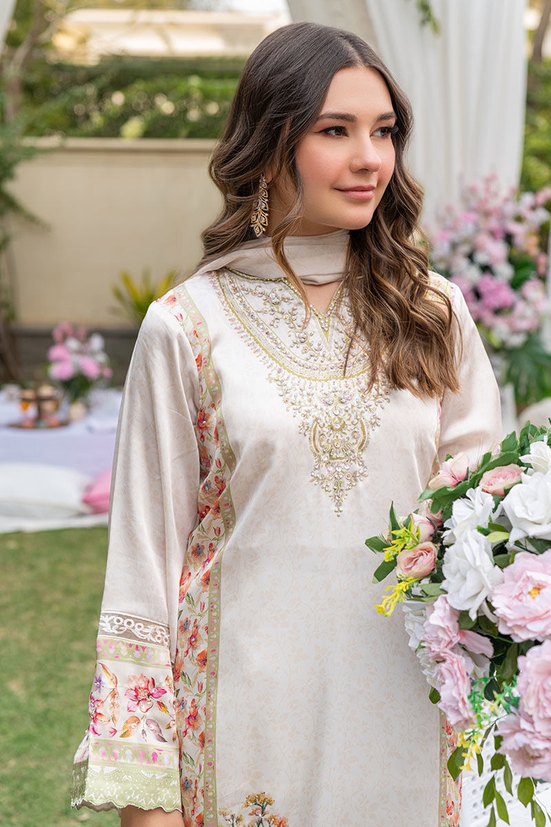 This gorgeous articles features a silk digital printed ivory a-line shirt with floral motifs with a fully embellished neckline, daaman and side panels all finished with cutwork borders and paired with an ivory culotte pant and a similarly printed medium silk dupatta with heavy tassels