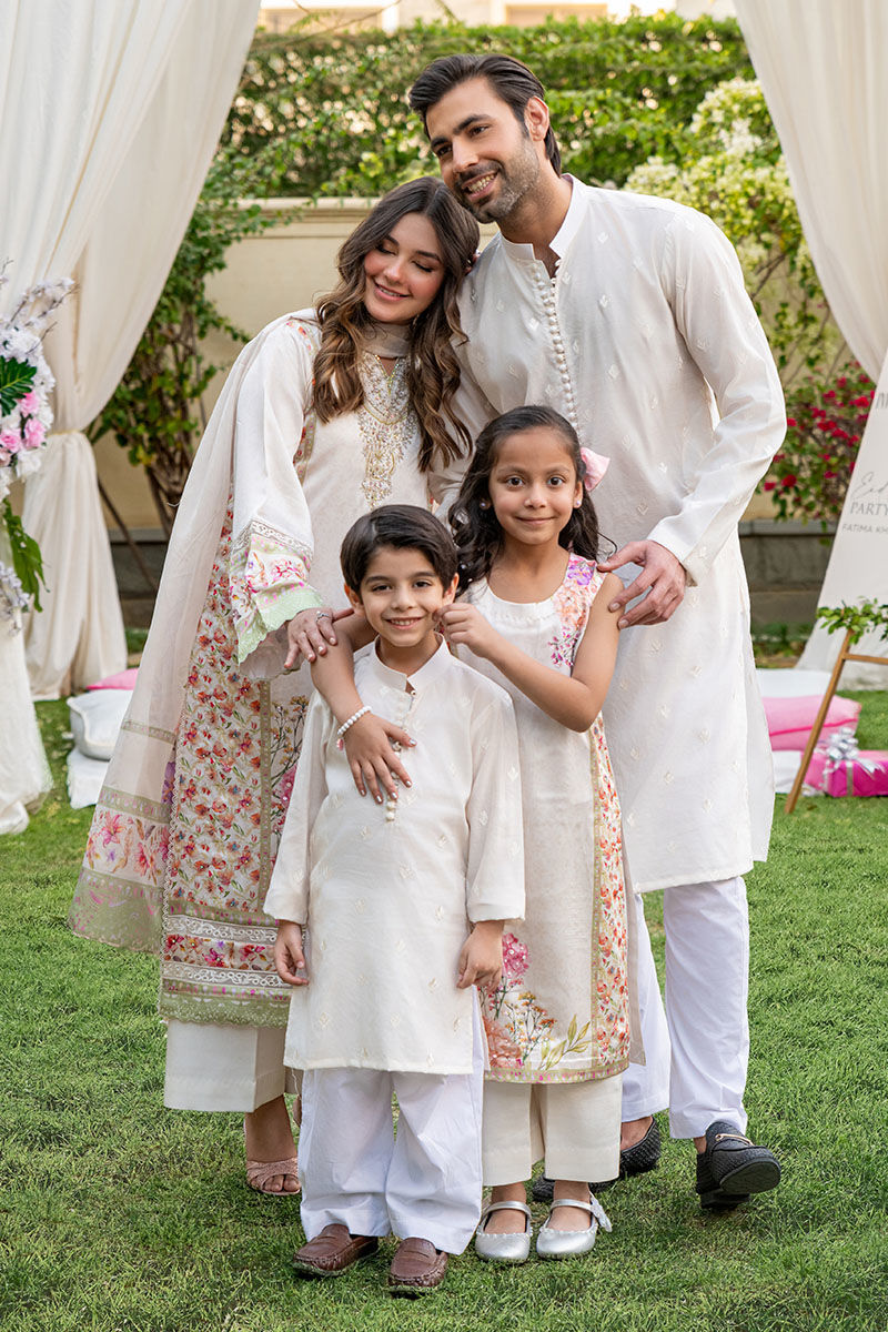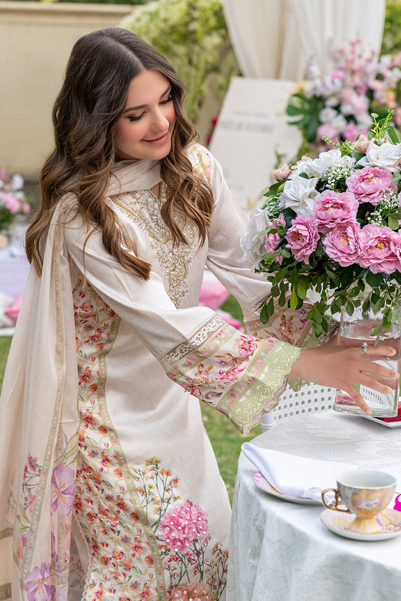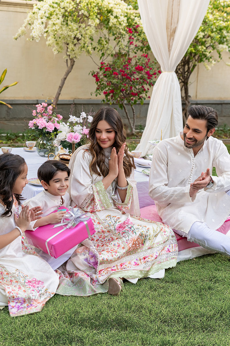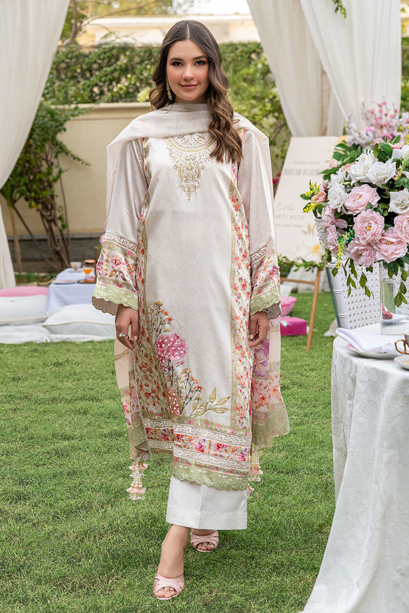 This gorgeous articles features a silk digital printed ivory a-line shirt with floral motifs with a fully embellished neckline, daaman and side panels all finished with cutwork borders and paired with an ivory culotte pant and a similarly printed medium silk dupatta with heavy tassels