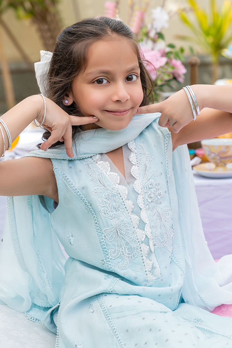 This modern article features a cotton silk three panel A-line shirt with an embroidered and embellished neckline, daaman and side panels all finished with block print and pleats details all paired with a straight pant and chiffon dupatta.