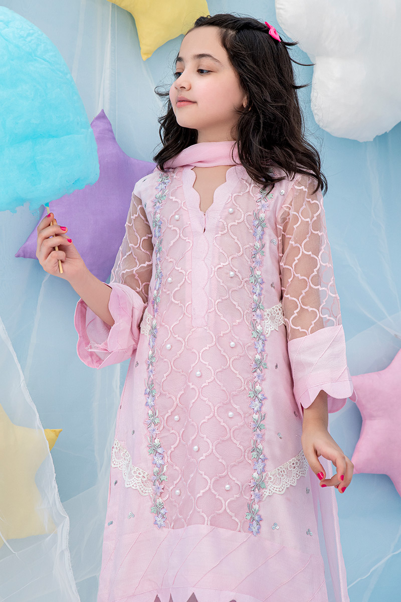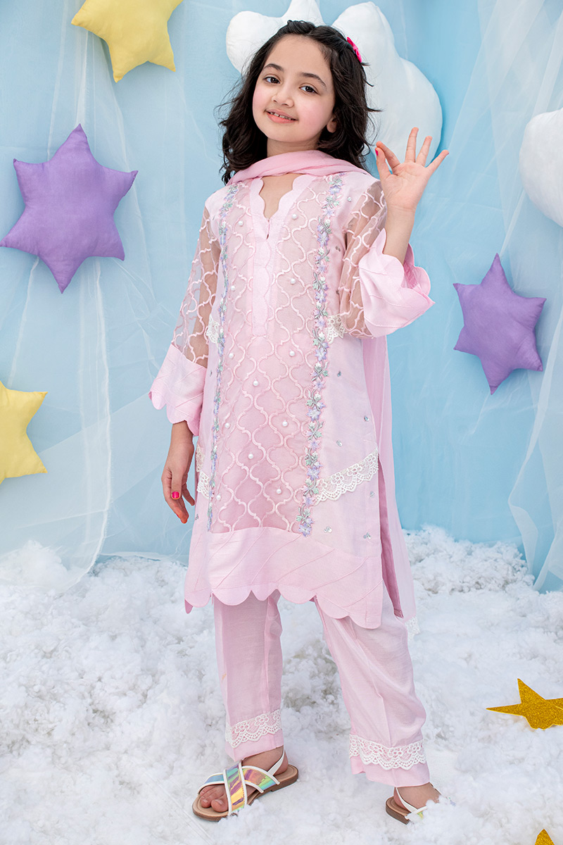 3 panelled mini kurta net with embroidery, lace and handwork embellishments.