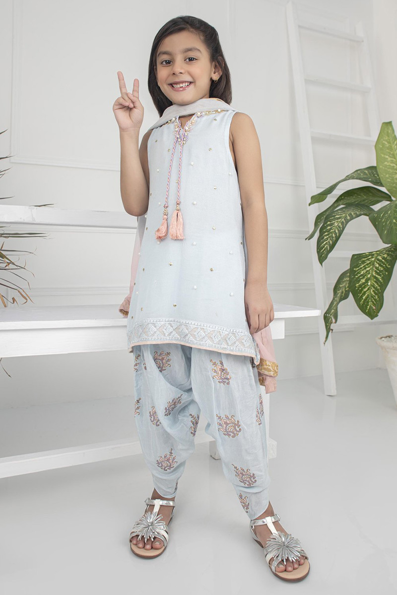 Peplum Chiffon Shirt with Embroidery and handwork embellishments comes with trendy scallop tulip pants.