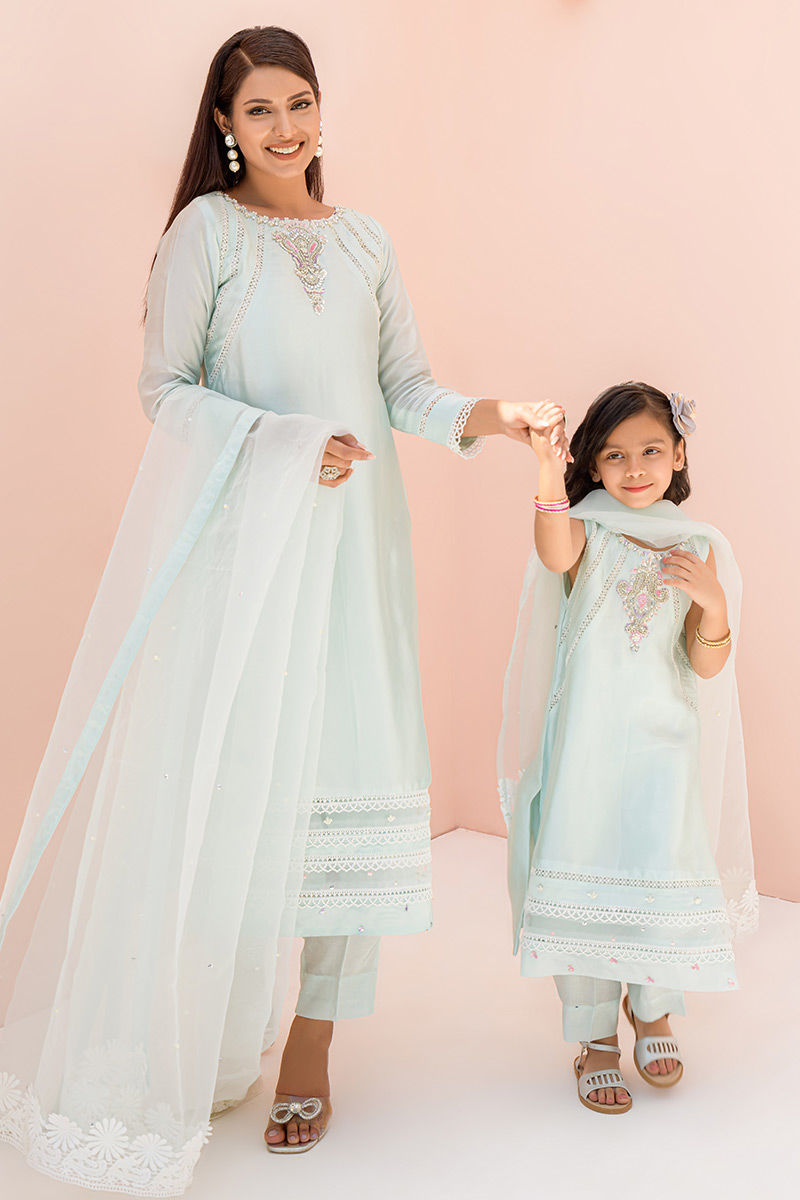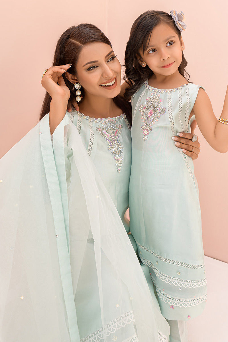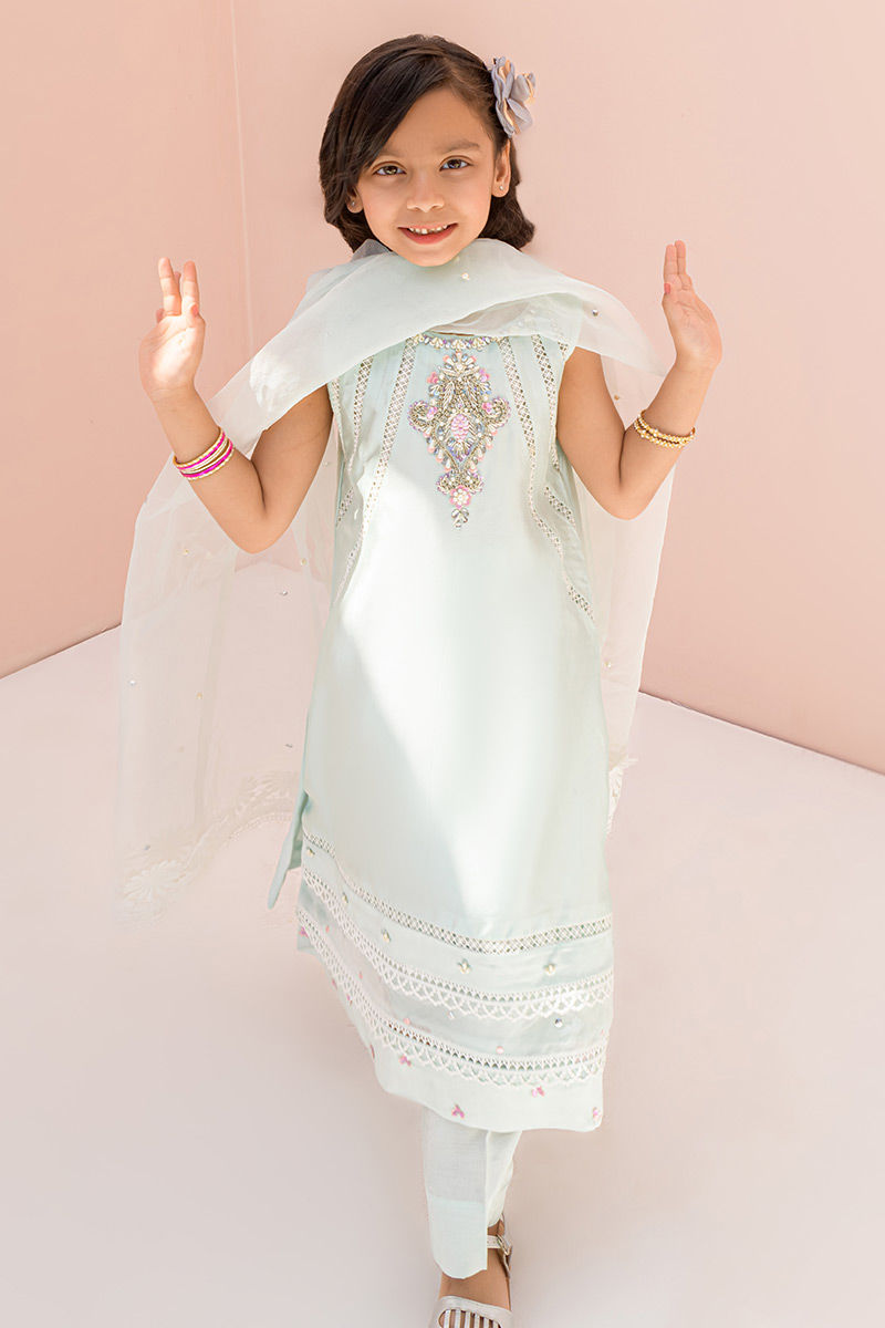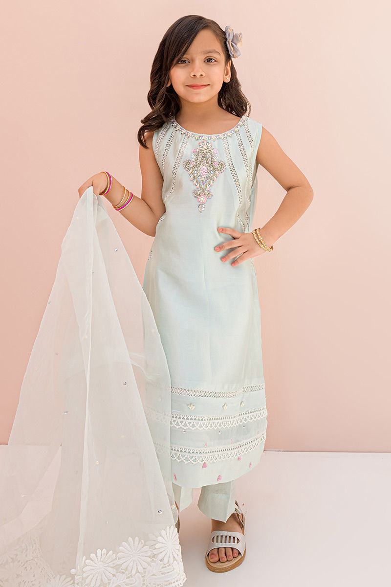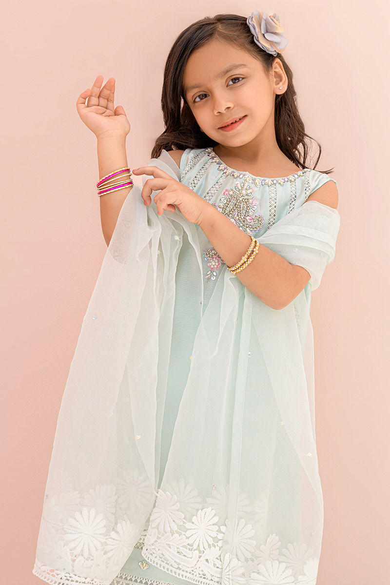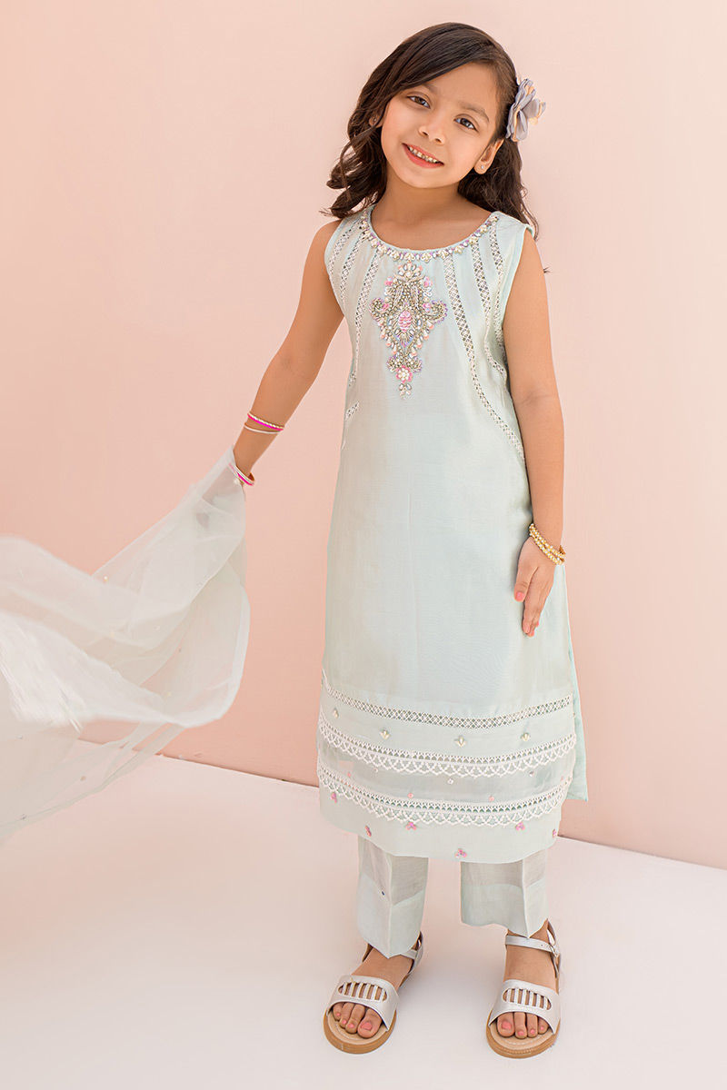 For on-trend occasions, this beautiful Mini Dizzle Blue silk A line is absolutely stunning. It is decorated with intricate thread laces and detailed trendy handwork embellished work. Can be paired with straight pants and an embellished organza dupatta.