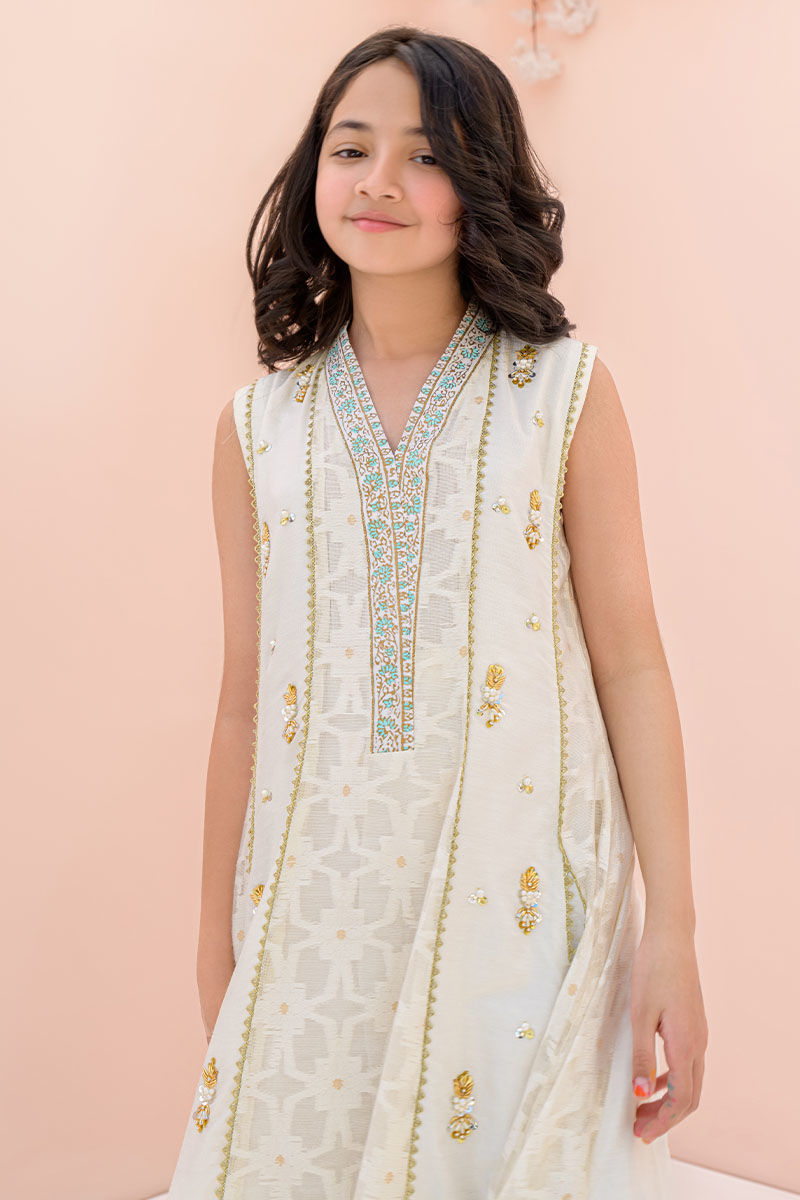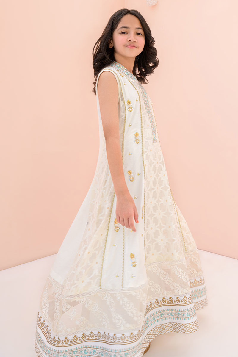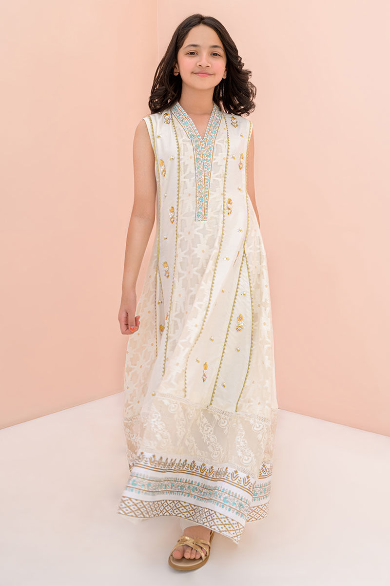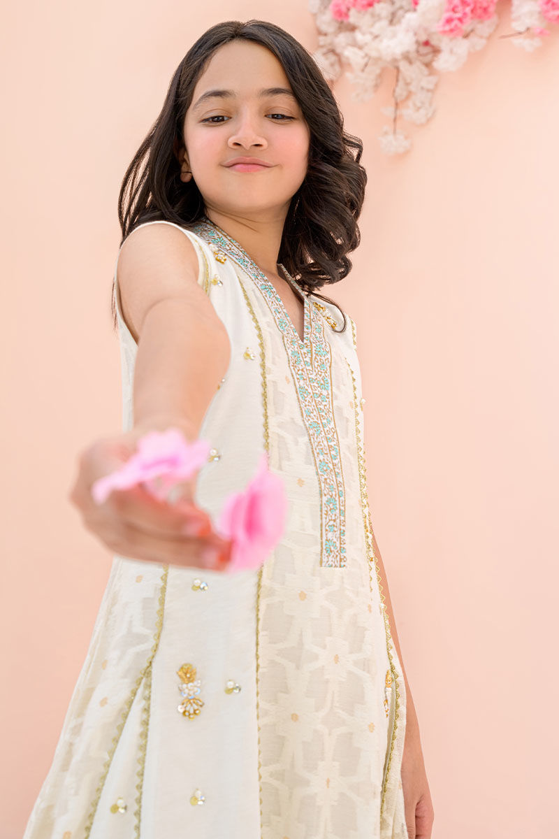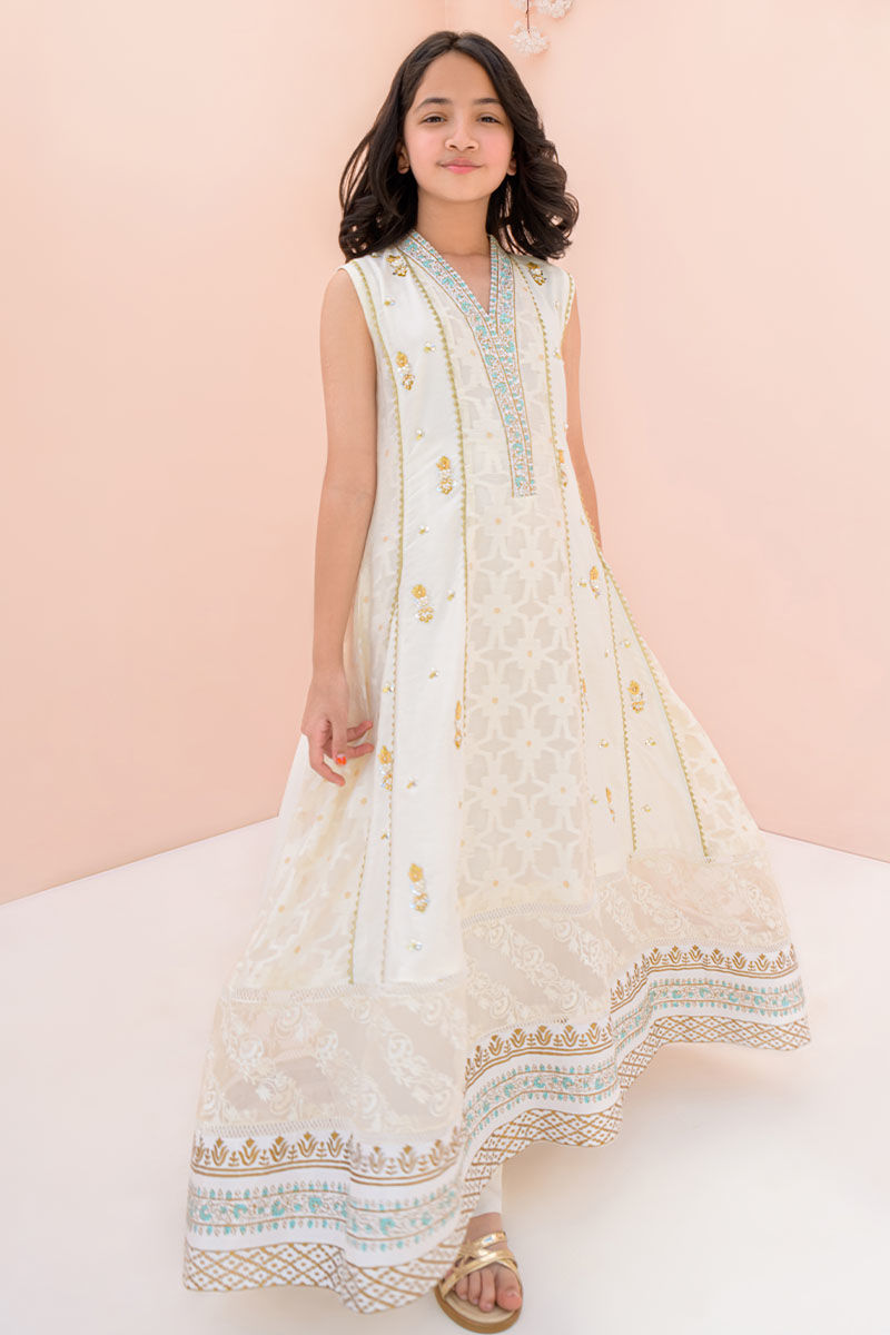This cute excitingly designed offwhite kalidar is perfect for various occasions it is furthermore enhanced with intricate hand embroideries and a block printed neck and hemline.