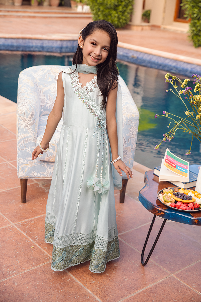 A striking Signature Kalidaar in soft mint hues, complemented by subtle tones of white. The embroidered borders and sleeves, paired with the angrakha cut, bring a touch of elegance, while intricate laces add detailed charm to the ensemble. It's a masterpiece of sophistication and style, combining beauty with intricate craftsmanship