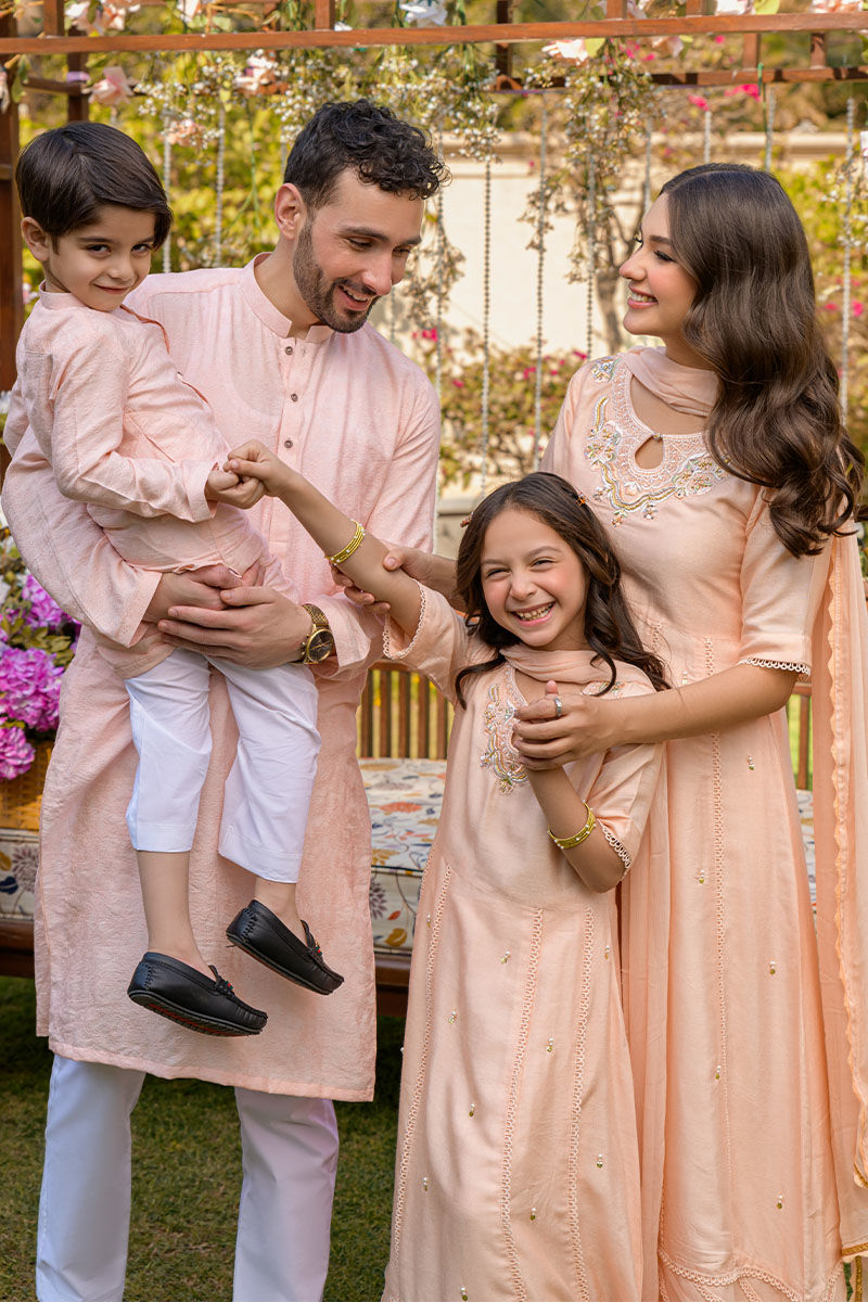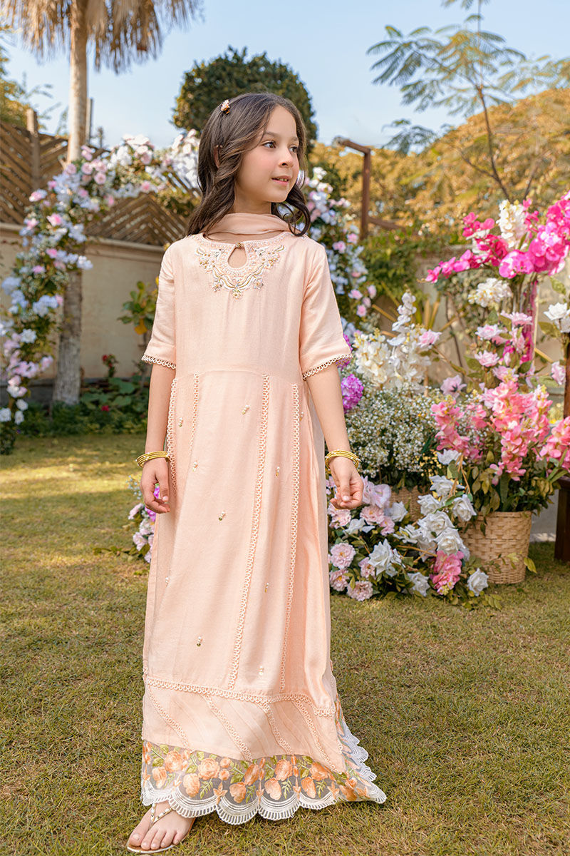 Color: Peach Fabric: Shirt: Khadi Net. Pant: Cotton Work Details: Embroidery, Lace Details