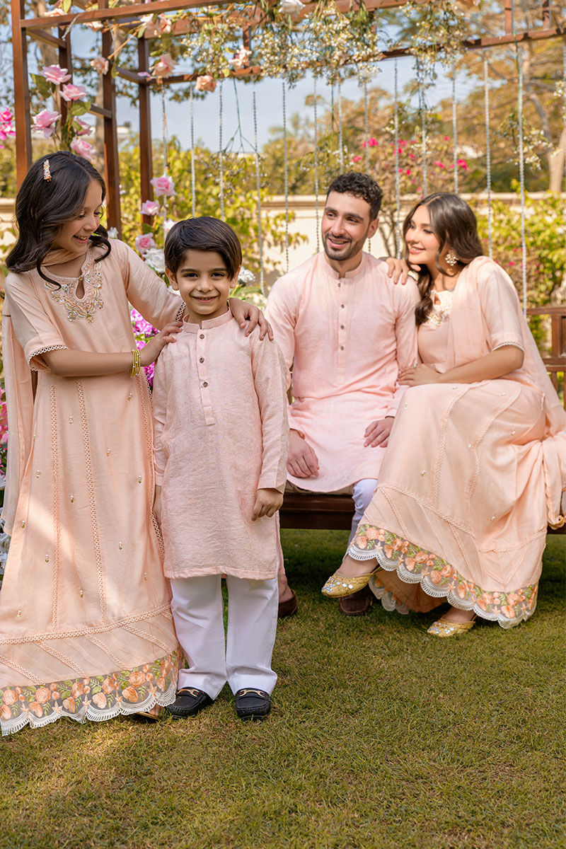 Draped in the soft allure of peach, this outfit is a symphony of femininity and charm. Delicate lace details and intricate embroidery elevate the ensemble, ensuring you stand out with an artistic flair. Paired with matching pants, it's a well-balanced and stylish statement