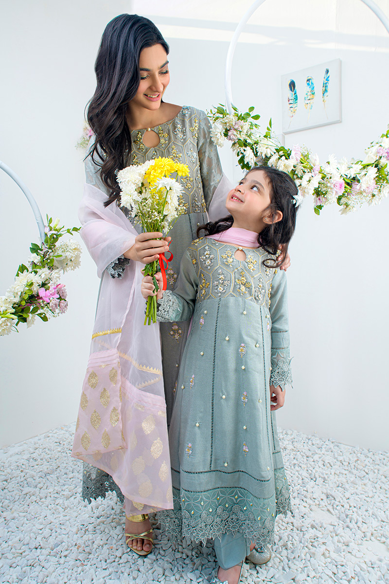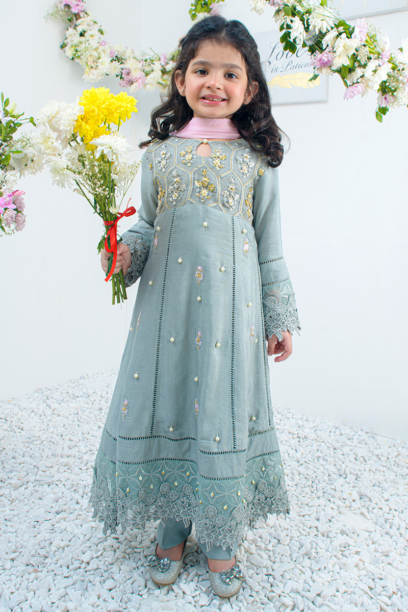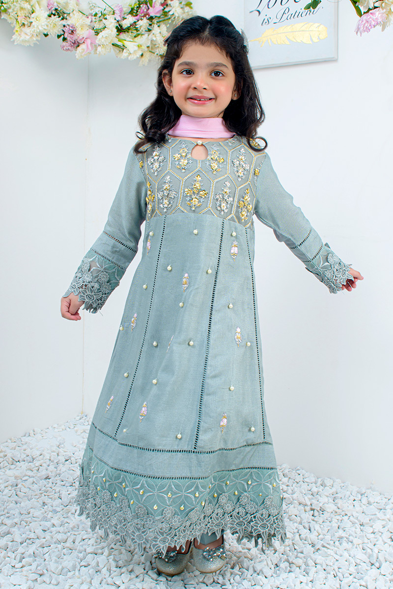 A beautiful grey kalidar with a lovely , hand embellished bodice with feminine cut and fabric textured hemline . The full length cut of the shirt adds flattering length and style for any age and shape! Additionally silver tissue duppata adds oomph to the look!
