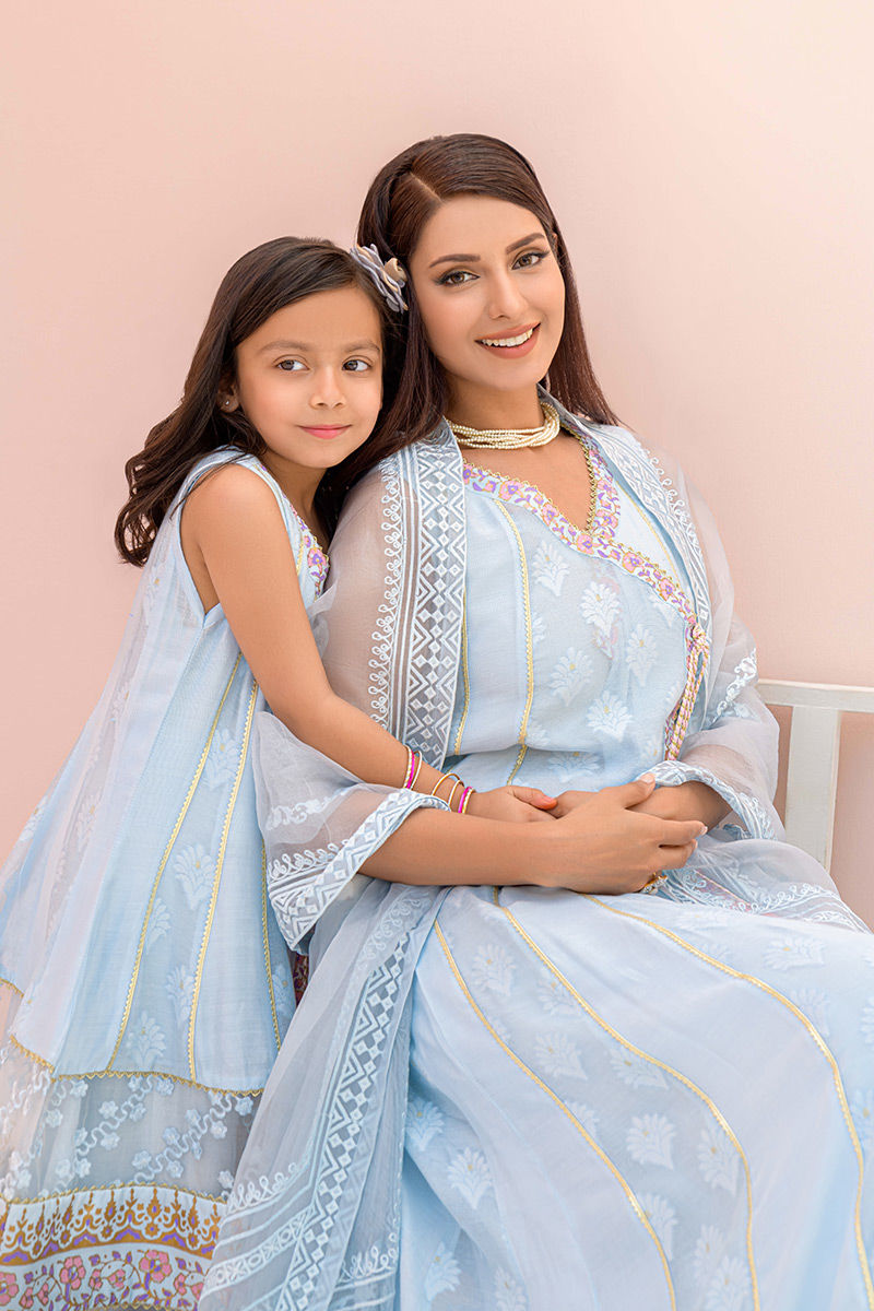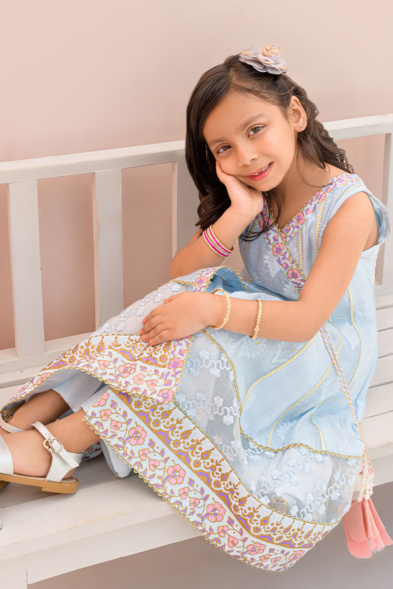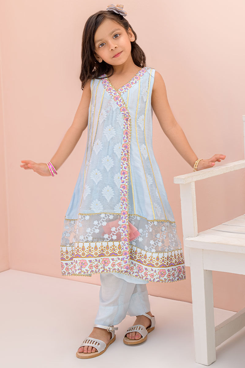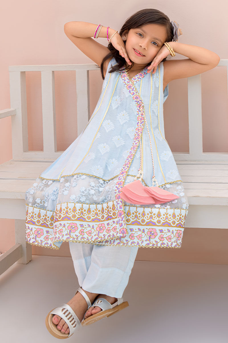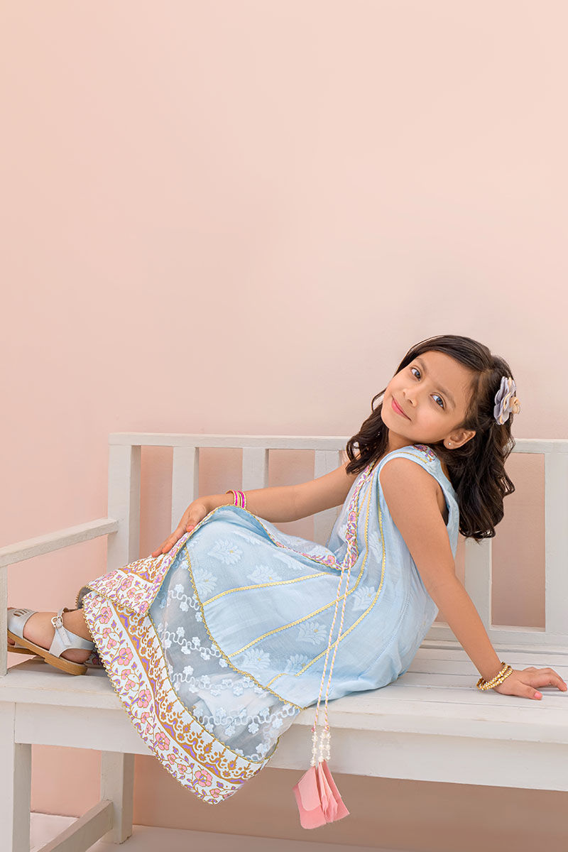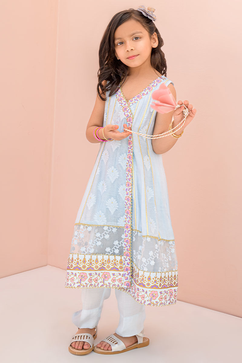 An angharka styled pishwas in ice blue color on pure self-banarsi khadi net with block printed front, sleeves, and hemline heavily, adorned with beautiful tassels hemmed with embroidered borders. It can be paired with an embroidered organza dupatta and cotton silk pants.