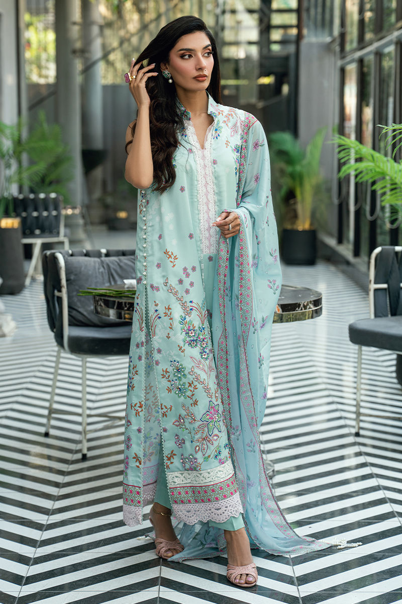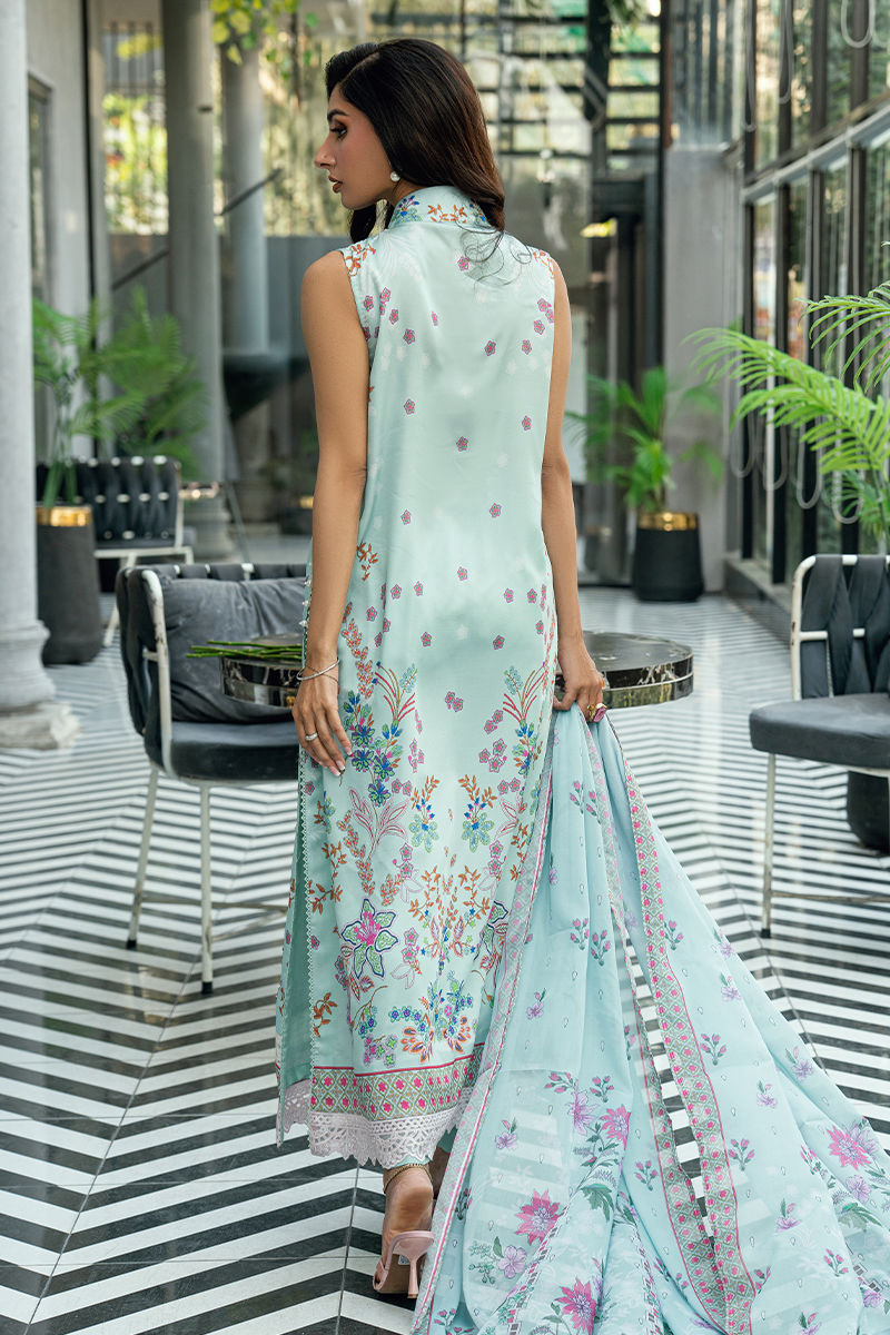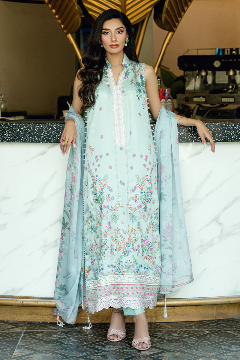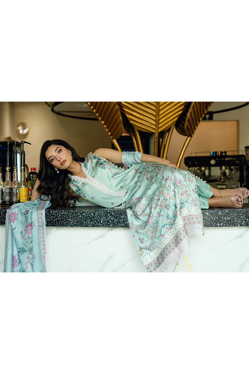 This elegant three-piece outfit is crafted in a refreshing mint–aqua base, adorned with delicate digital floral prints in soft shades of blush pink, lilac, lavender, muted coral, ivory, and subtle hints of sage green. The color palette feels light, feminine, and refined—perfect for graceful daytime dressing.