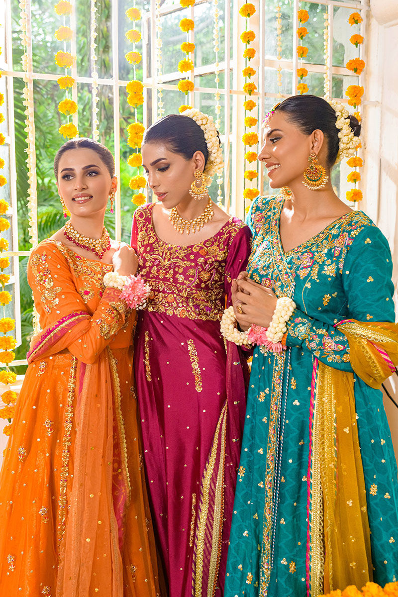 An exquisite sea green self khadi net angrakha, gracefully embellished with intricate resham embroidery and hand-crafted details of dabka, sequins, and cut dana. This piece radiates refined elegance. Paired with a striking mustard jamawar dhaka pajama, it creates a chic and stylish contrast that demands attention. Completed with a contrasting mustard French net dupatta, adding a layer of opulence to the look.