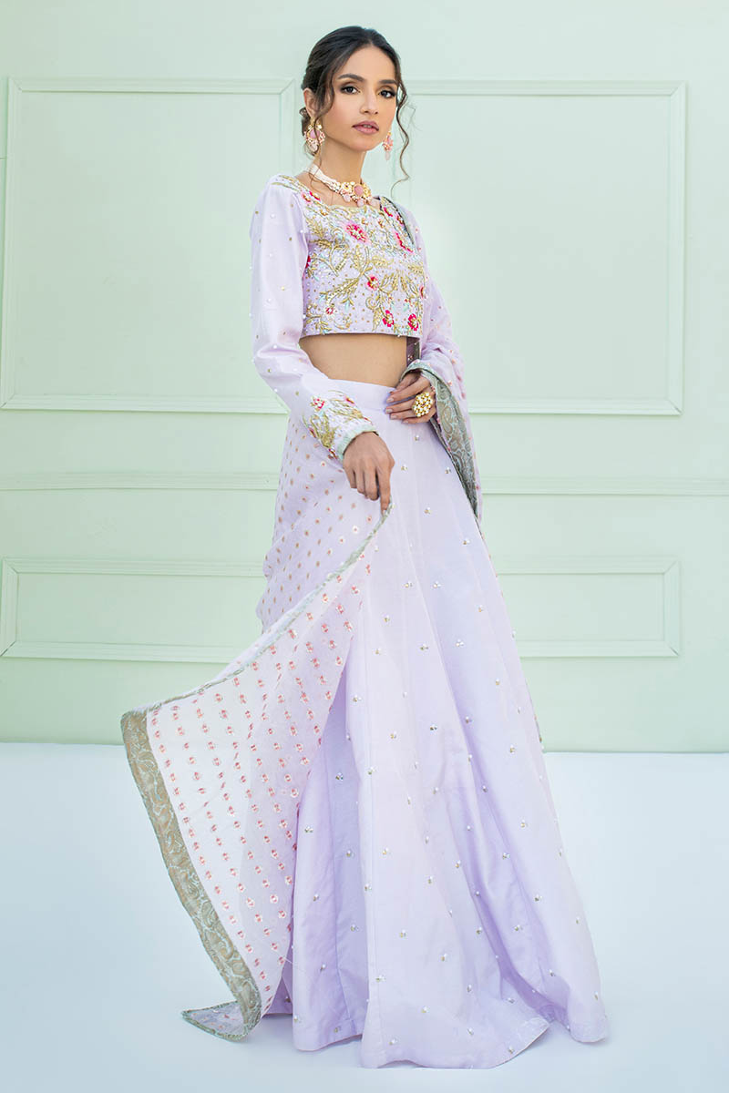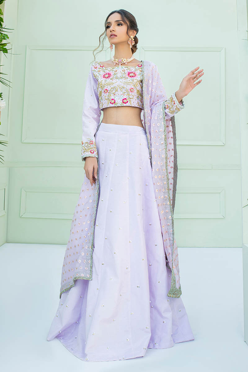 Heavily thread hand embellished blouse in lilac color paired with same colored Lehnga is all what you need for the coming festive season.