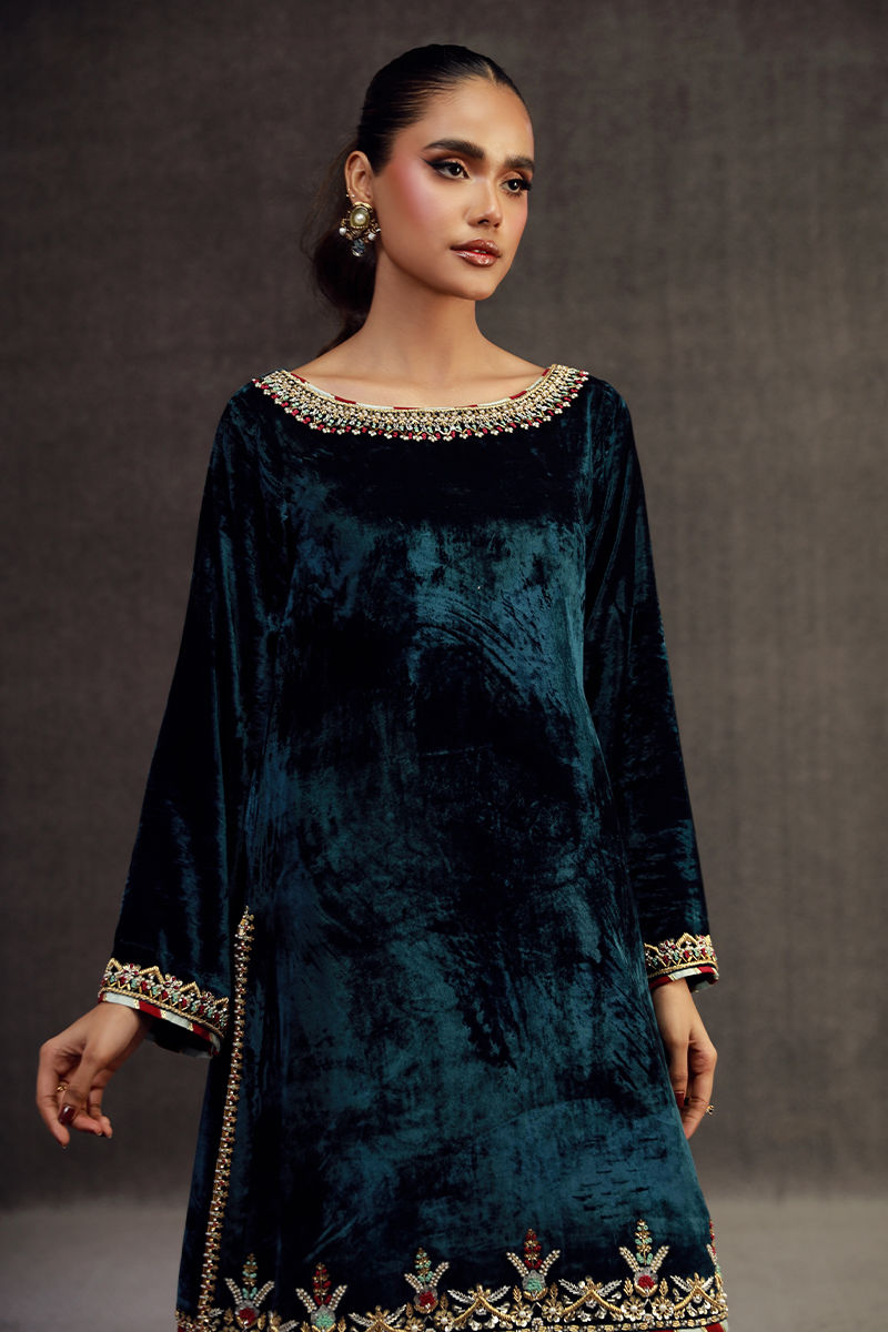 Color: Teal Blue Fabric: Velvet Work Details: Embellished And Embroided