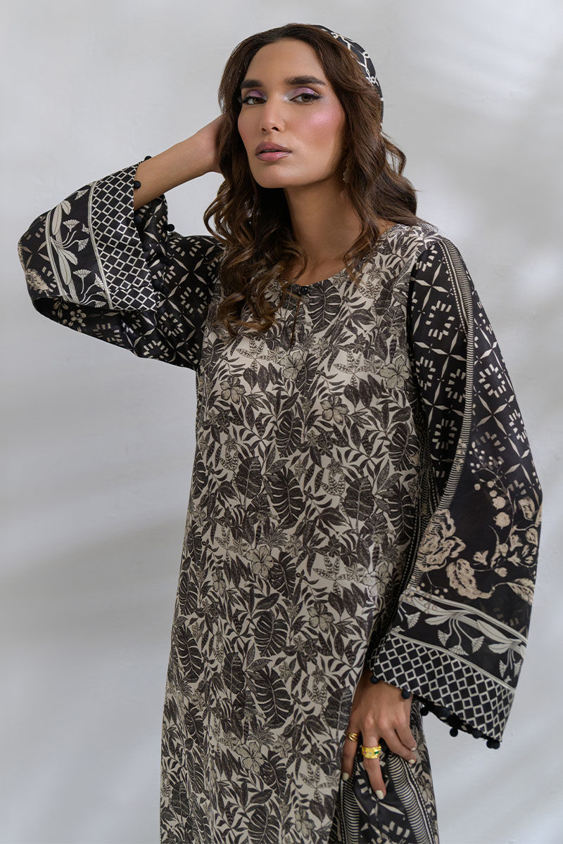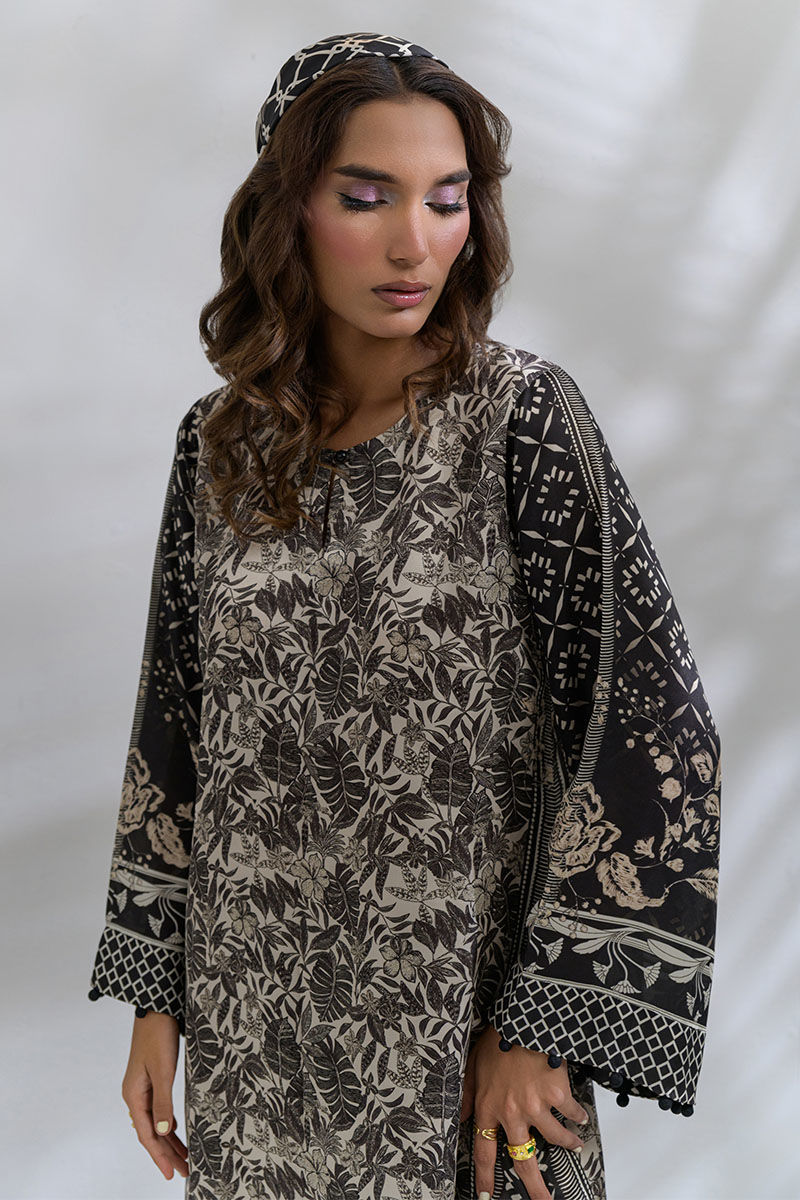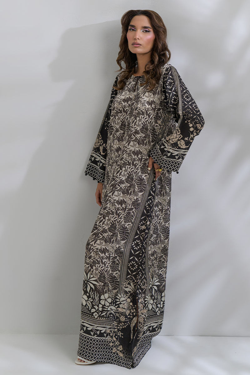 Elevate your everyday style with this elegant breathable shamooz silk kaftan, featuring a beige and black color palette. This is a long anklelength kaftan with flowy bell sleeves which is perfect for casual outings, summer-time movie nights or even breezy dinner dates.