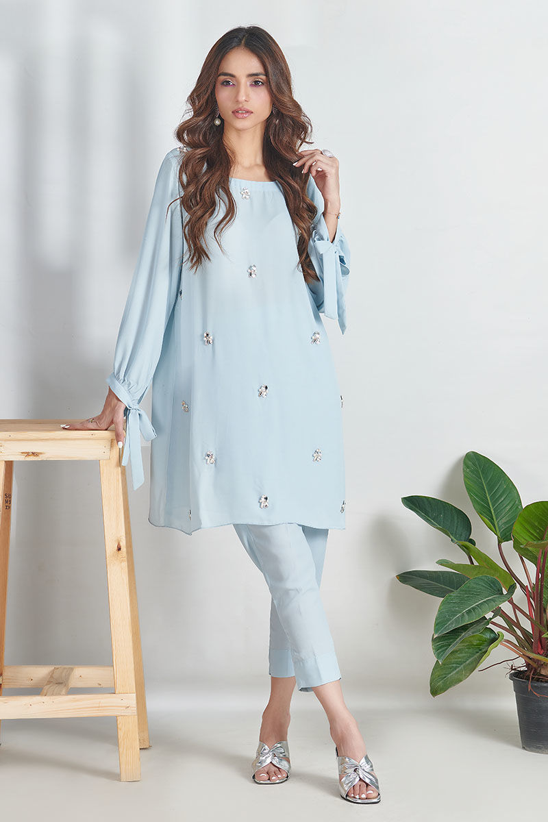 A signature moon-soon blue co-ord set with minute stone spray detailing all over the shirt. Perfect pick to cater all your festive needs.Includes Shirt and Trouser