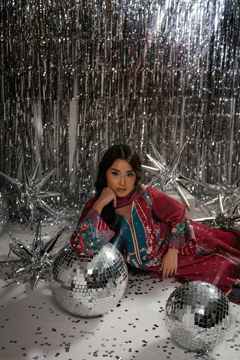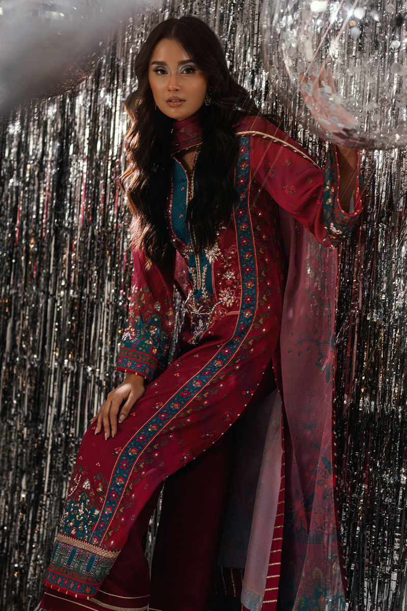 An elegant digital print ensemble featuring a long-length shirt in rich magenta tones, paired with a matching trouser. The design is enhanced with a self-digital pattern that exudes understated luxury. A beautifully composed digital print dupatta completes the look, adding depth and sophistication. Perfect for festive gatherings or refined daywear with a touch of modern tradition.