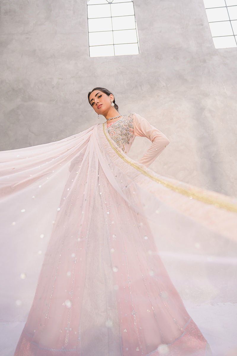 An ethereal pastel peach-pink peshwas crafted on delicate net fabric, adorned with intricate silver embellishments, pearl accents, and fine zari work. The ensemble flows gracefully with a heavily bordered hemline in soft coral tones, perfectly balanced with a sheer dupatta edged in antique gold. Regal yet romantic, this look is ideal for day weddings and receptions, radiating timeless elegance.