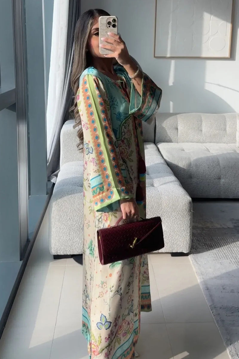 Embrace a more sophisticated style with this elegant breathable shamooz silk kaftan, featuring a beige and light blue and chartreuse color palette. This is a long ankle-length kaftan with flowy sleeves which is finished with a contrasting tassel details on the neckline which makes it perfect for your summer affairs.