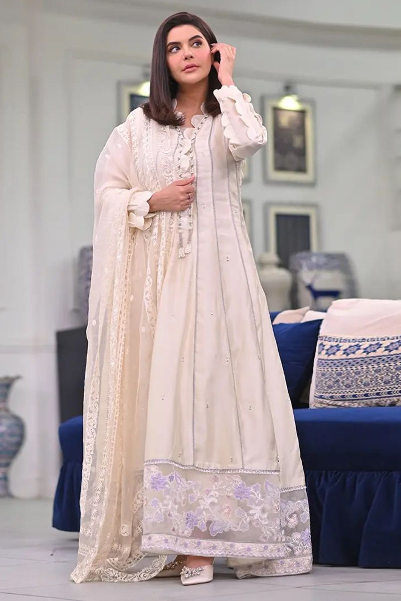 Experience sophistication in a dreamy silk kalidar, meticulously crafted with a richly embroidered hemline, delicate laces, and intricate handwork embellishments. The ensemble is elevated by a heavily embroidered dupatta adorned with pearl tassels, creating a refined aesthetic that exudes elegance.