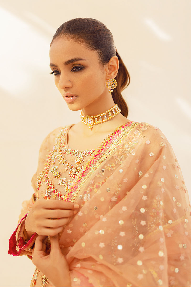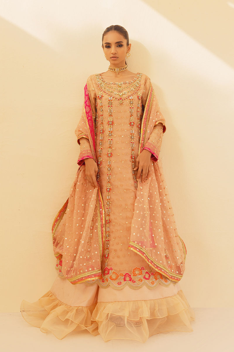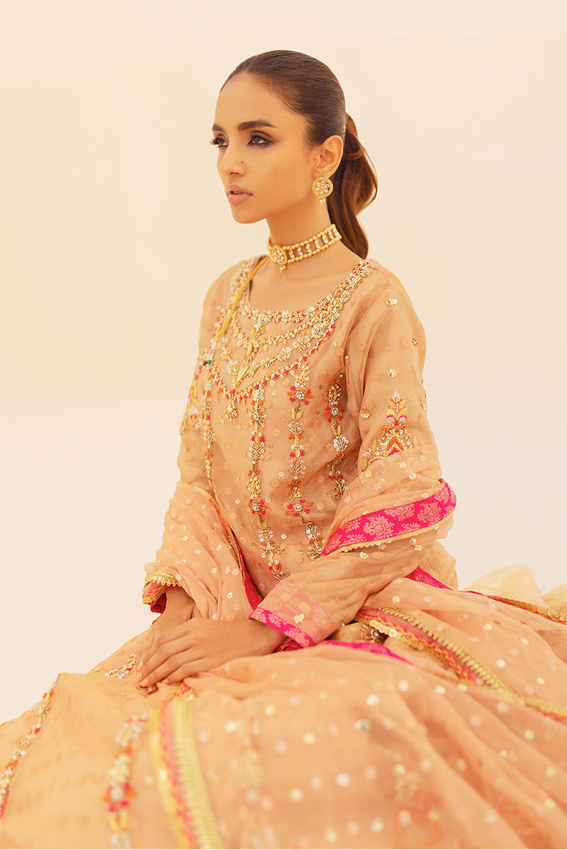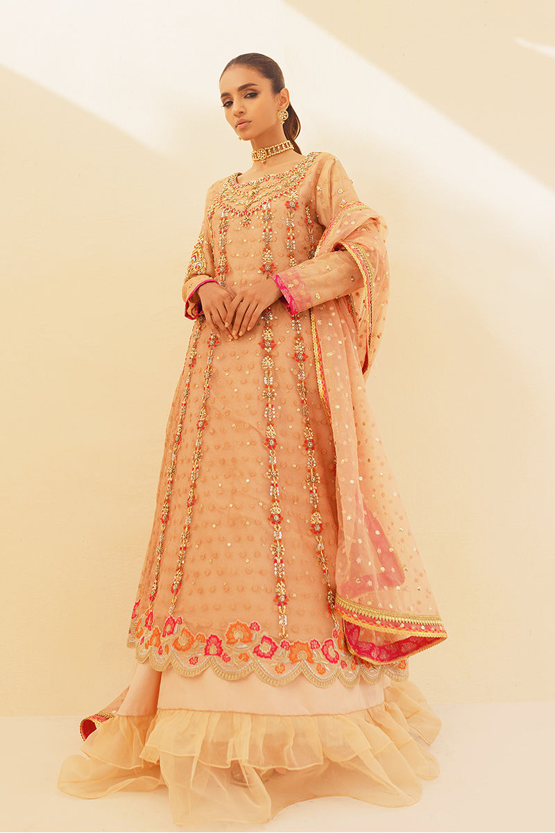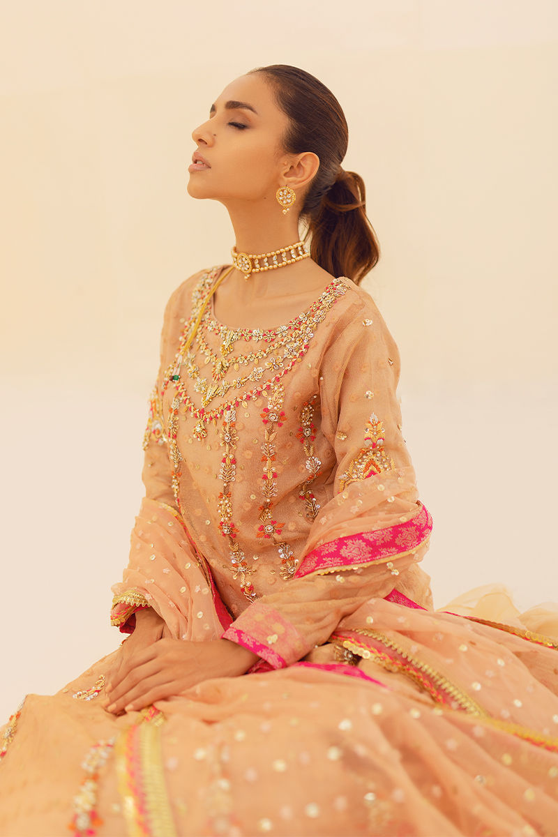 A peachy gold zari net pishwas . Gloriously worked around the neck, the panels of this pishwas feature paisleys hand work with embroideries on the hemline and delicate trimmings. The look is finished with a sheer embroidered organza dupatta, and fish net lengha.