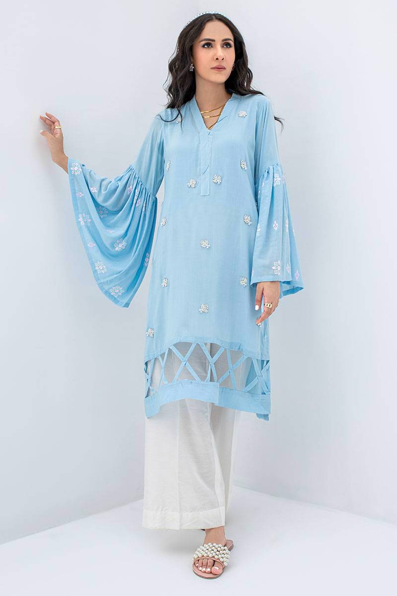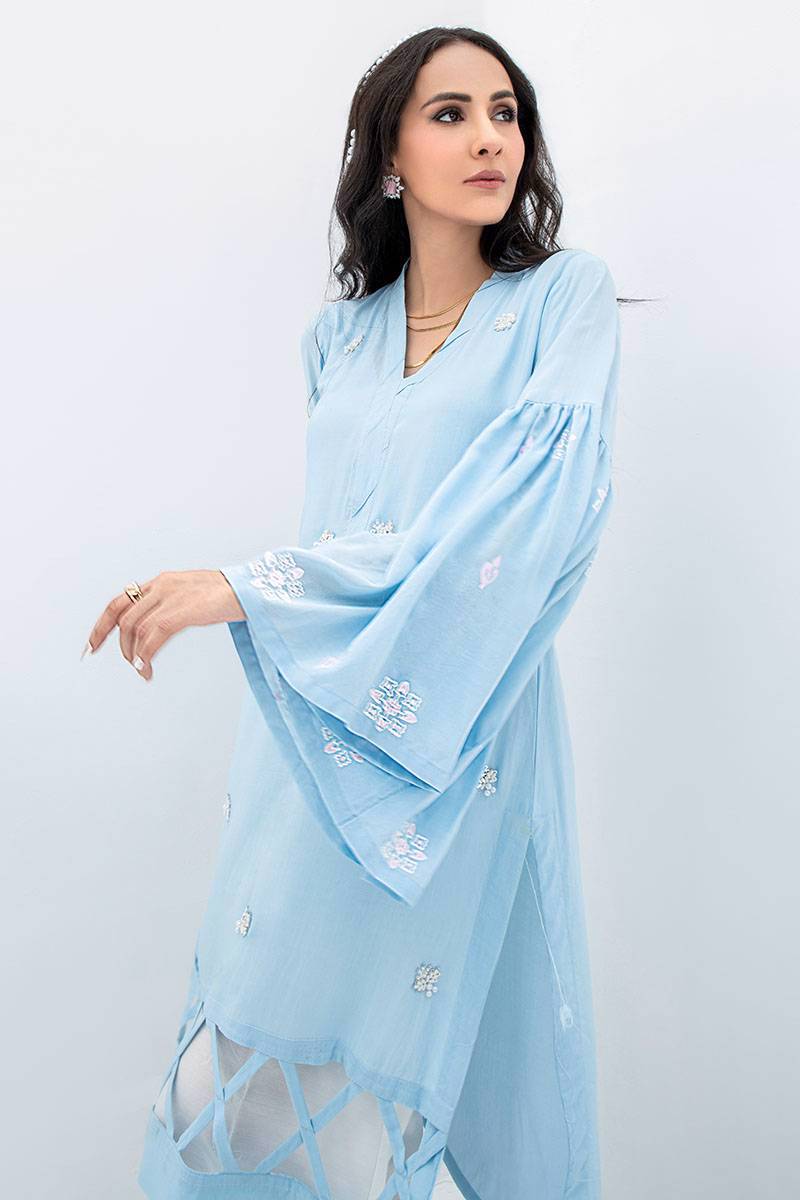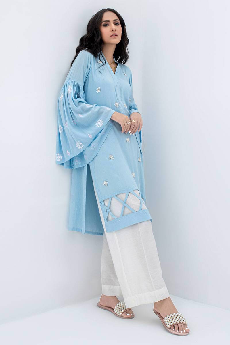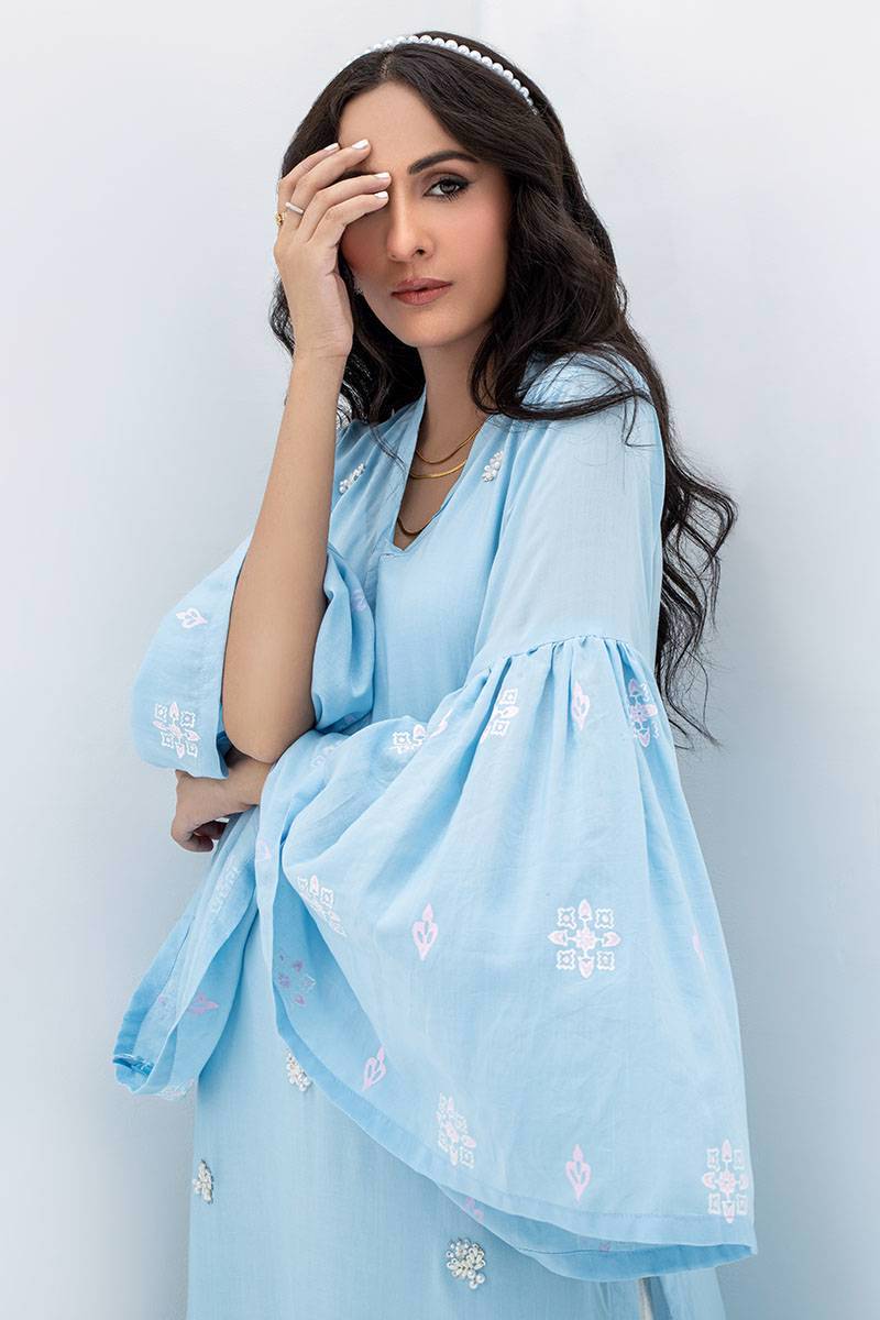 A beautiful blue shirt with lovely embellished work along with block-printed bell sleeves. Paired up with azaar pants.