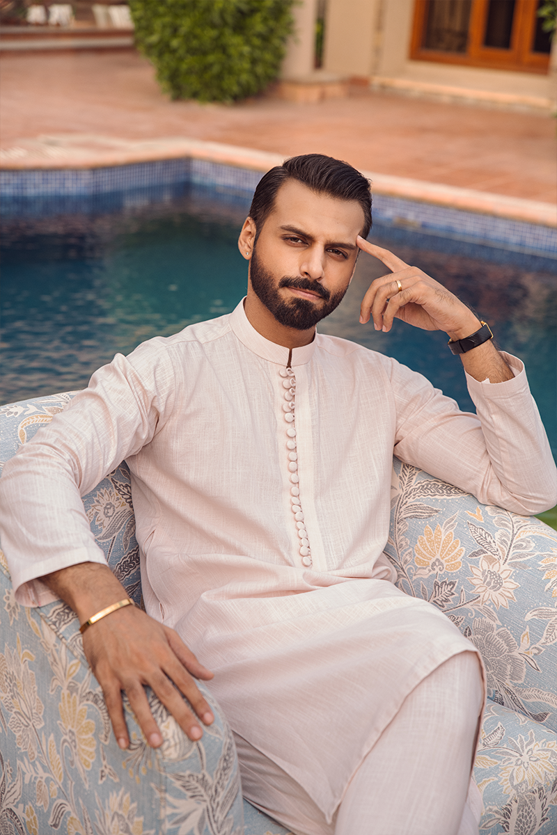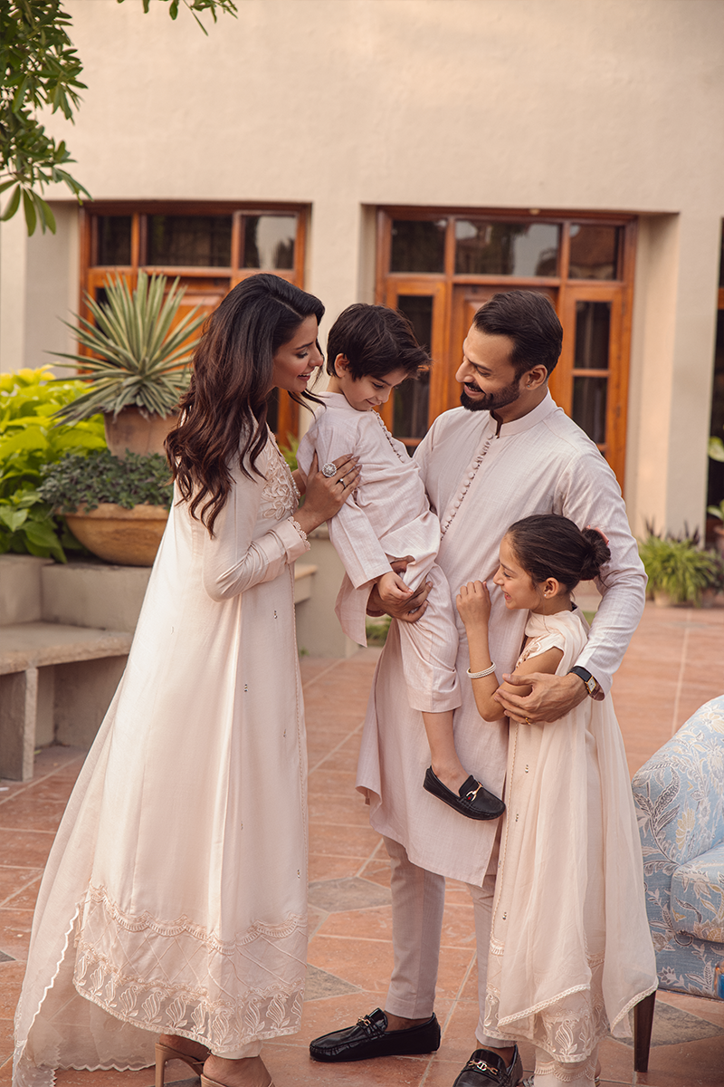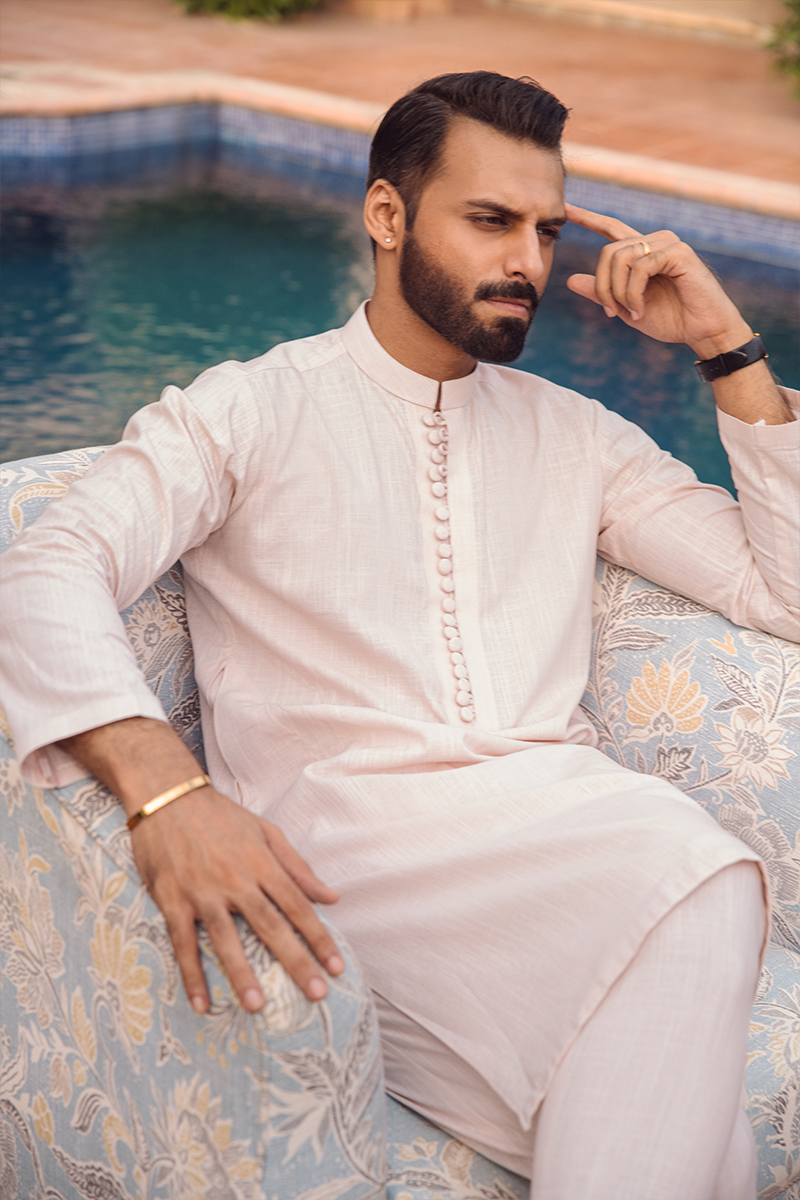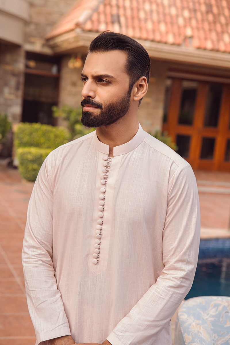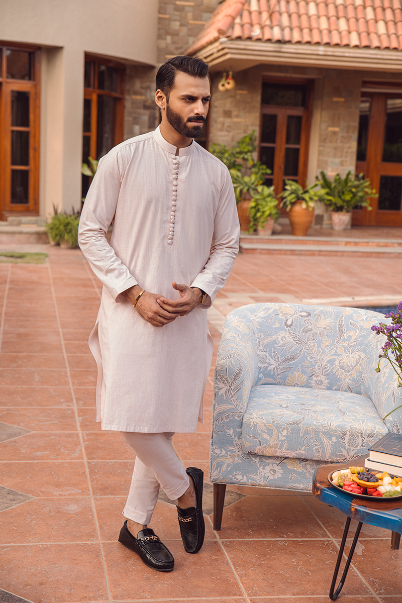 A beige cotton kurta with a subtle self-textured design, paired with straight dyed cotton pants. It's a classic, understated look that exudes simplicity and sophistication