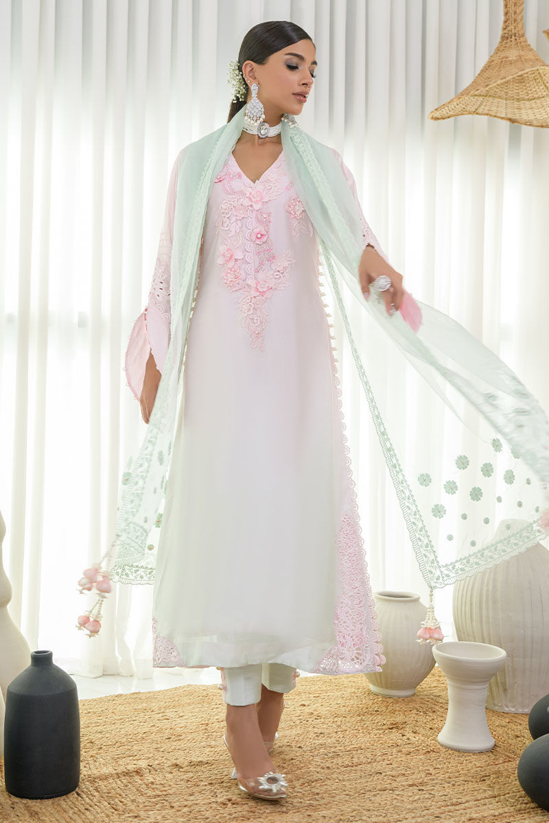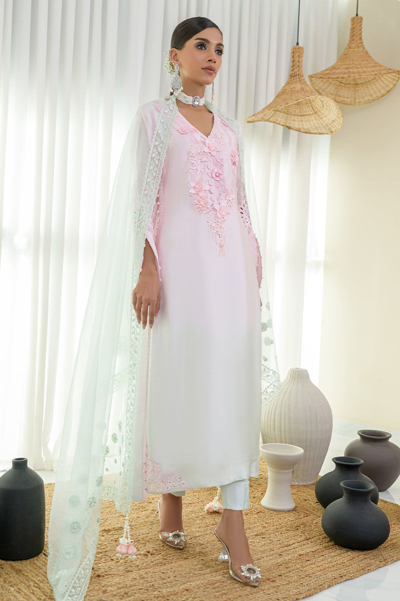 This ultra-flowy two-toned creation is perfect for spring festivities, boasting a stunning ombre color. The elegant silk long shirt features a beautiful neckline adorned with exquisite 3D embroideries, pearls, and sequins for a summer glow. The ensemble gracefully transitions from pink to mint, embellished with floral cutwork motifs and trendy sleeves. Paired with silk long pants and a two-toned embellished dupatta, this look exudes elegance and sophistication, ideal for any special occasion.