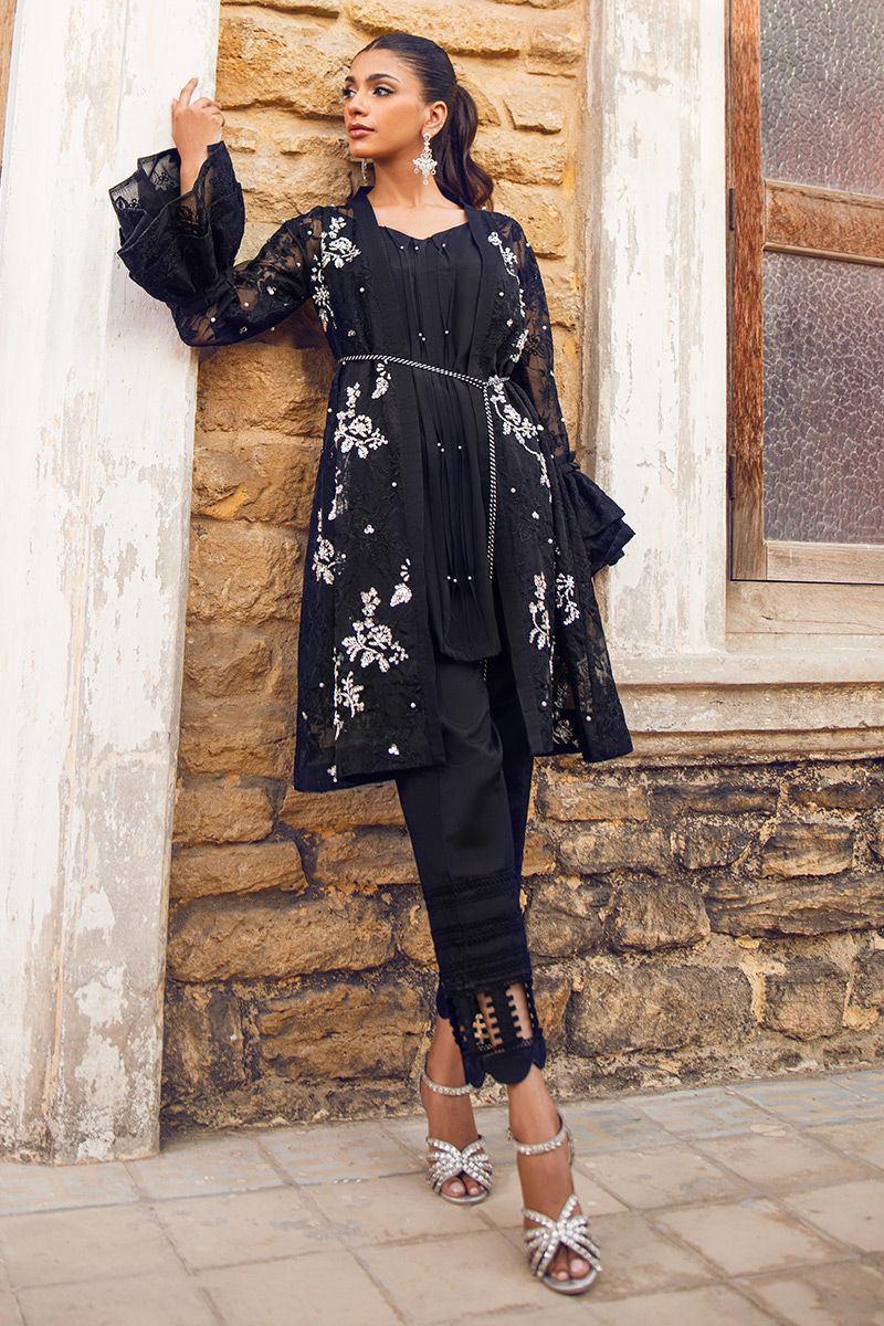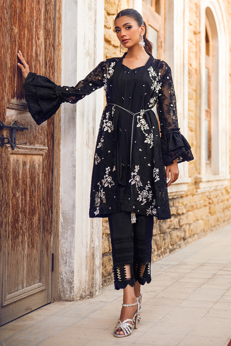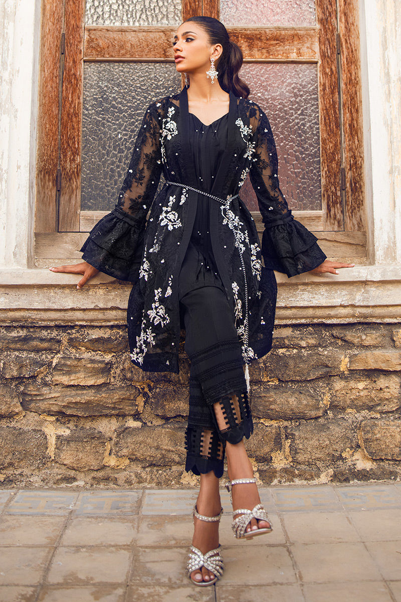 The black Ophelia Jacket, adorned with sequins and organza embroidery featuring nakshi, crystals, sequins, and pearls, exudes glamour and luxury. Layered over a silk-textured slip with a customizable halter neckline, it offers a chic and sophisticated look. Coordinating lace details on the pants add elegance, making it a statement piece for special occasions—a perfect blend of style and craftsmanship for a fashion-forward and glamorous ensemble.