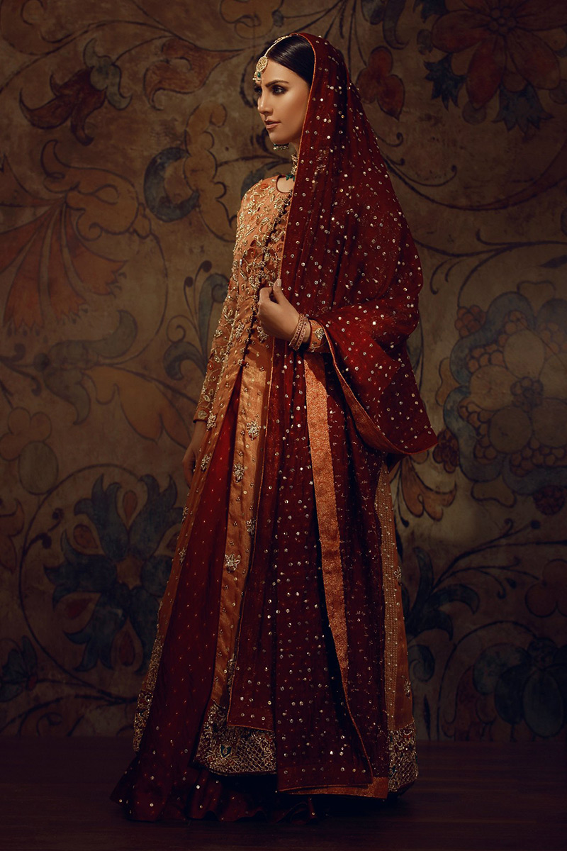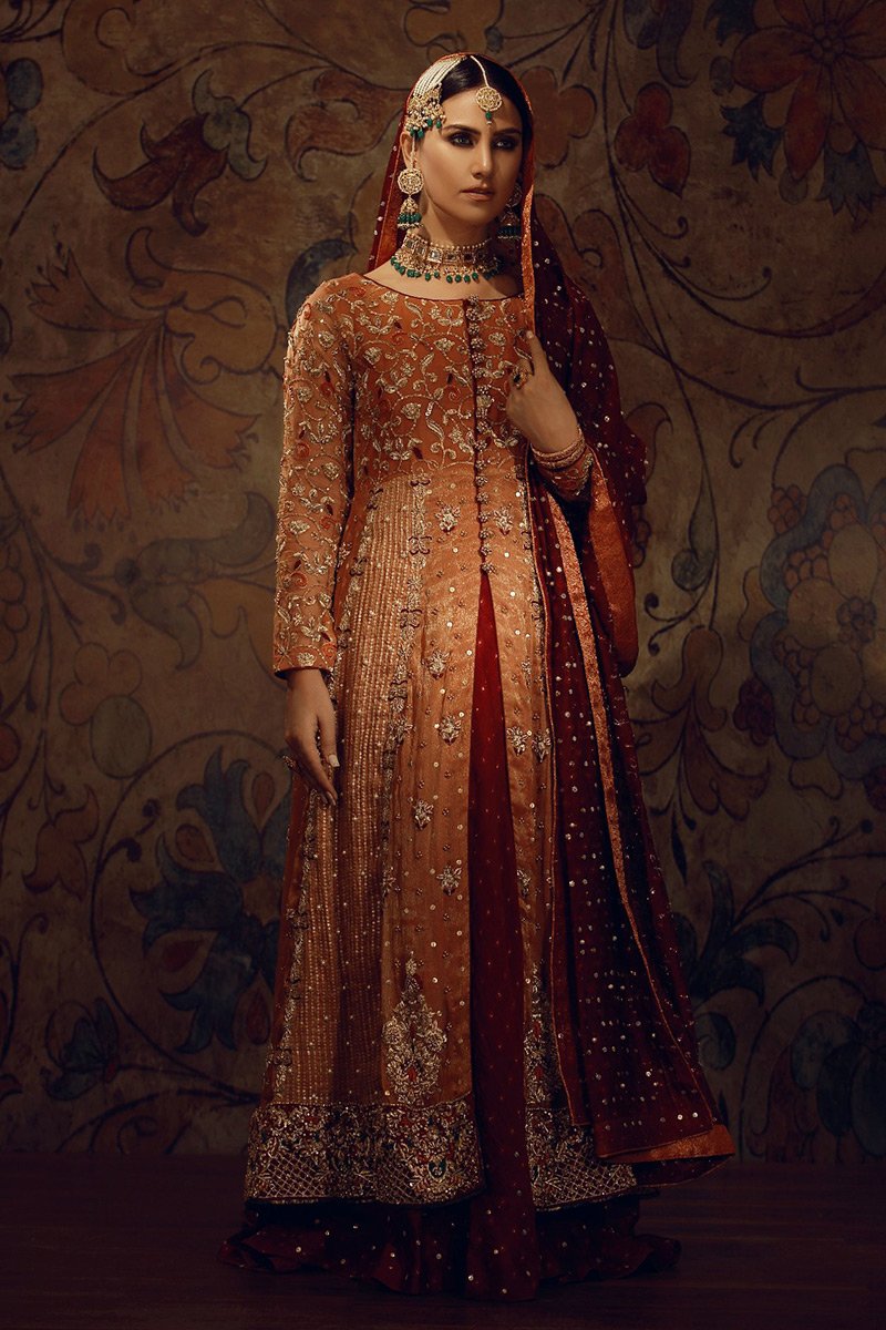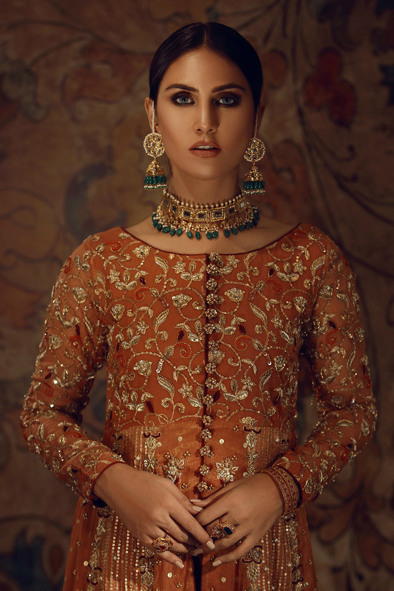 This traditional rust kalidaar is a celebration of timeless craftsmanship and elegance. Daintily embellished, it features intricate handwork of zardozi and dabka, meticulously applied to create an exquisite tapestry of tradition. The starry sequin spray adds a celestial sparkle to the ensemble, enhancing its rich texture and making it perfect for festive occasions. This piece embodies the essence of classic beauty while showcasing the artistry of traditional handwork.