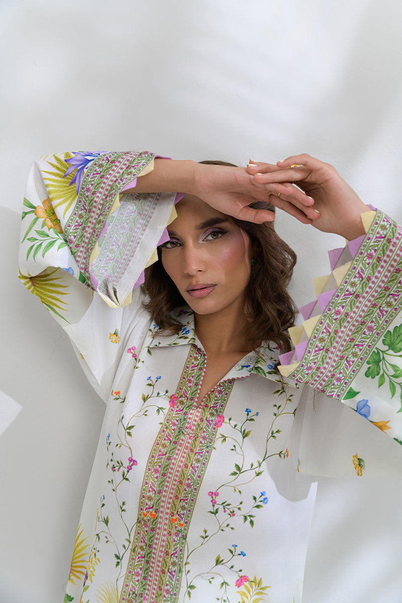 Elevate your everyday style with this breezy swiss lawn co-ord set that features a white base and shades of yellow, green, pink and blue. This is a lightweight, flowy kurta-style short shirt that is finished with fabric manipulation detailing along the cuffs, and is paired with tapered trousers that are similarly printed as the shirt. This outfit is perfect for brunches, casual gatherings, or festive daytime events