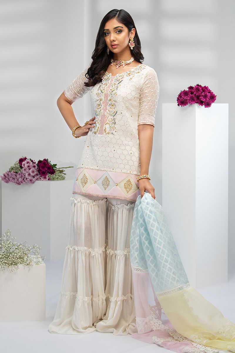 This lovely and traditional old school style short shirt with frill. Gharara with a screen printed and handworked details spice up your wardrobe. Additionally added organza dupatta adds oomph to the look.