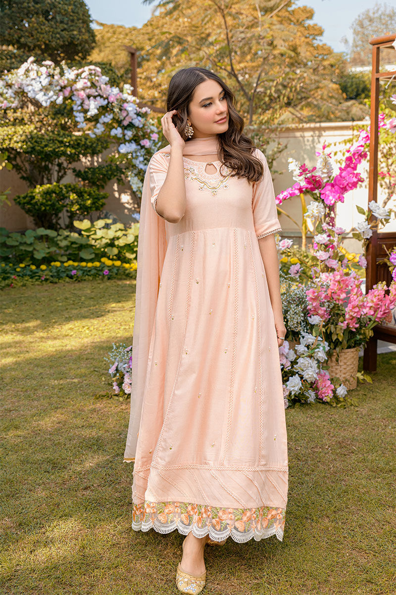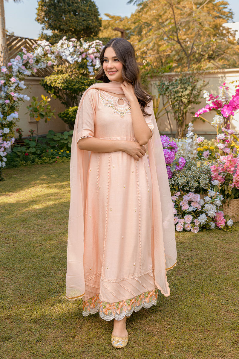 Color: Peach Fabric: Shirt: Khadi Net. Pant: Cotton Work Details: Embroidery, Lace Details