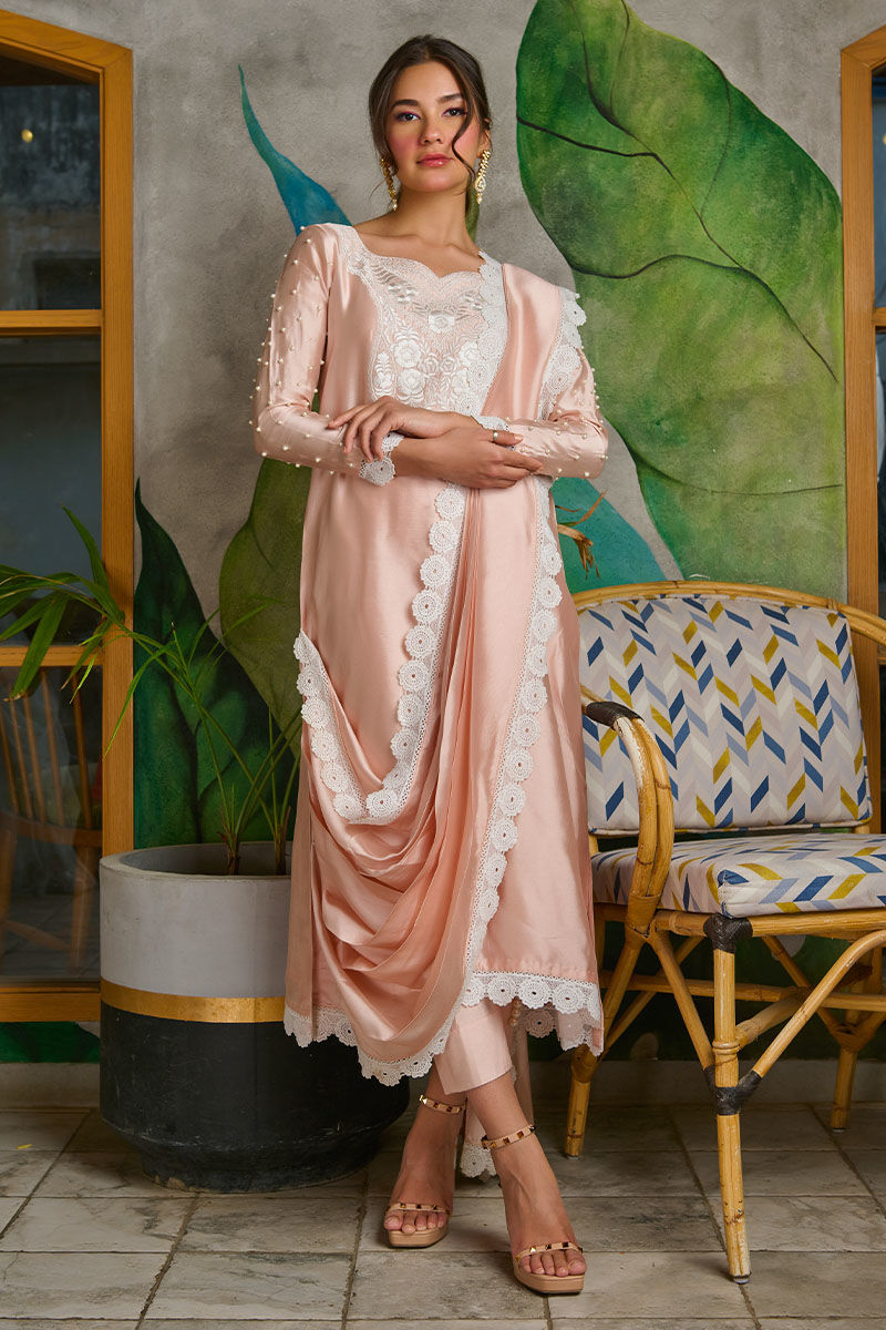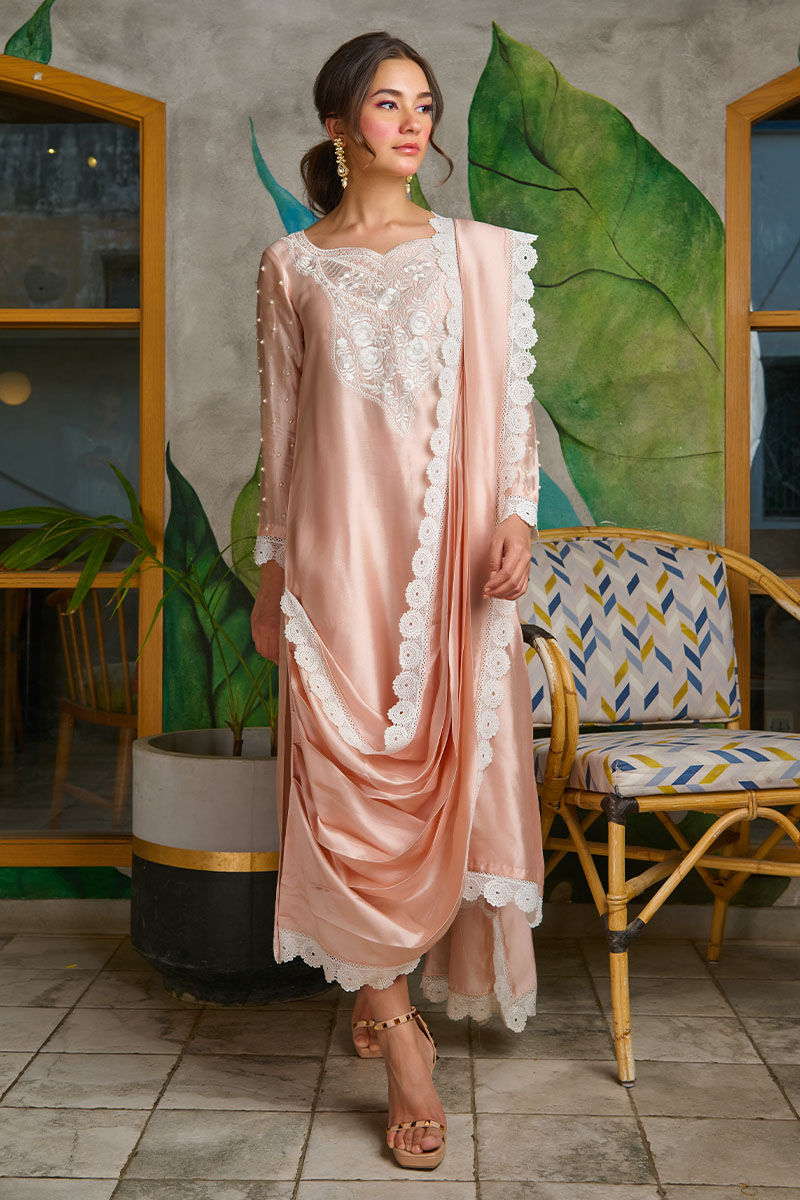 Peach-colored straight pure raw silk shirt with intricate embroidery on the neckline, further enhanced with pearl embellishments. This unique piece can be draped with a silk saree dupatta.