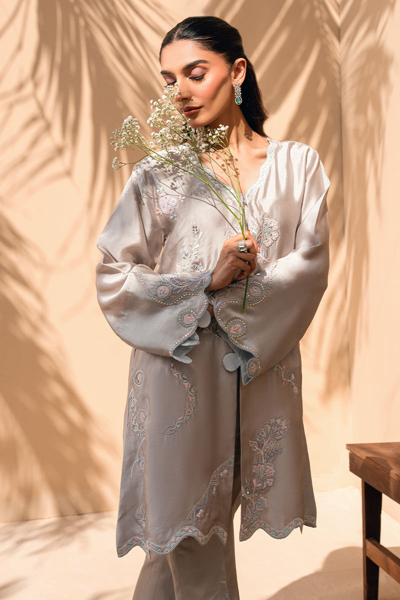 Soft, serene, and effortlessly feminine, this pearl-grey ensemble is a celebration of subtle craftsmanship. The straight-cut shirt is adorned with delicate pastel floral embroidery, complemented by scalloped edges along the hem and sleeves for a gentle, romantic touch. Paired with tailored bell trousers, the look is clean, modern, and timeless. Perfect for daytime festivities or intimate gatherings, this ensemble embodies quiet luxury with floral finesse.