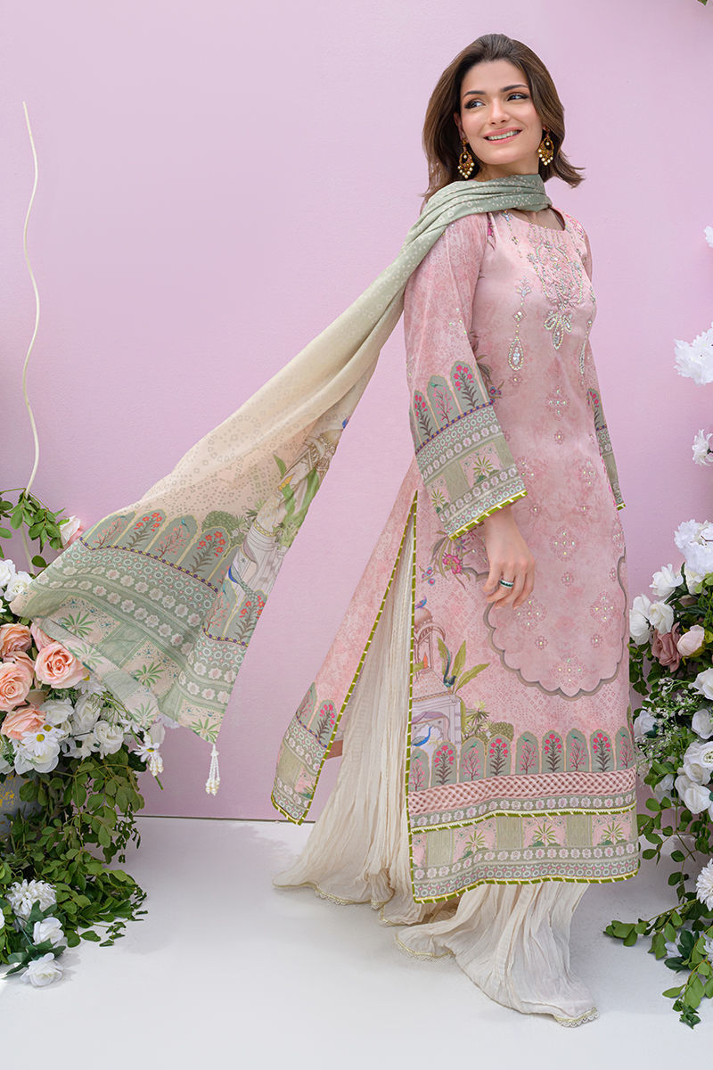 <p>This gorgeous article features a pastel pink digital printed long shirt. The design showcases a fusion of traditional Mughal and Chundri motifs with tropical palm trees, creating a unique and artistic composition. The neckline and front panel are intricately embellished, finished with delicate gota lace detailing. The ensemble is paired with contrasting crushed skirt and a printed dupatta, completing the look with effortless charm and cultural sophistication.</p>