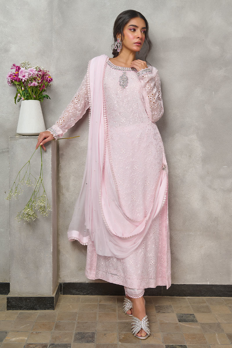 Baby pink embroidered chikan shirt on pure chiffon, intricate aari embroidery on neckline, and sleeves. It can be paired with silk embroidered pants and a wrap-around chiffon embellished dupatta.