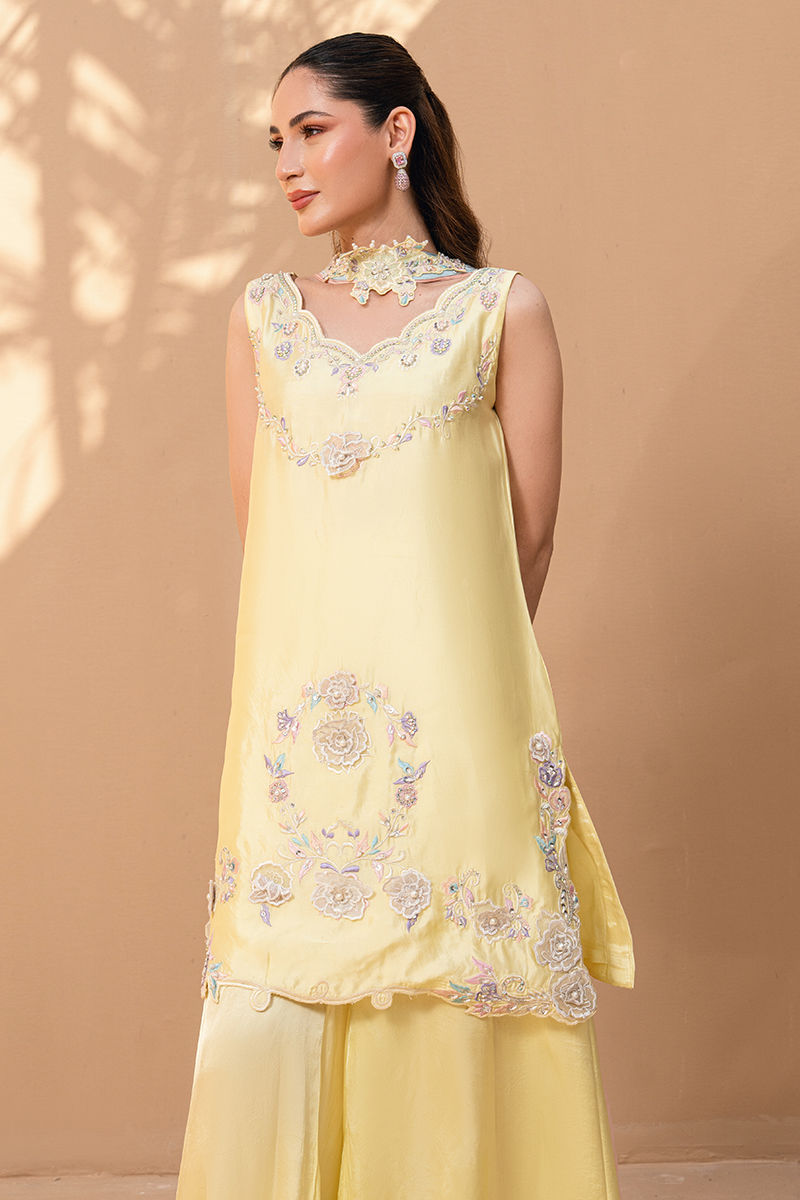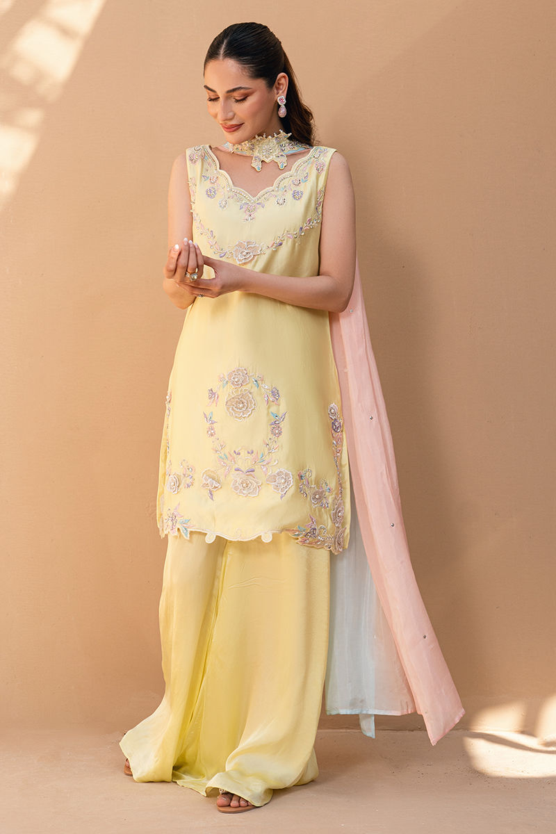 Radiating quiet elegance, this soft lemon ensemble is a celebration of subtle sophistication. The sleeveless long shirt features delicate floral embroidery across the neckline and hem, creating a balanced blend of refinement and ease. Paired with straight-cut trousers and a sheer blush dupatta, the silhouette feels light, feminine, and effortlessly polished. Perfect for garden gatherings, summer soirées, or festive luncheons, this look embodies modern grace with a floral touch.