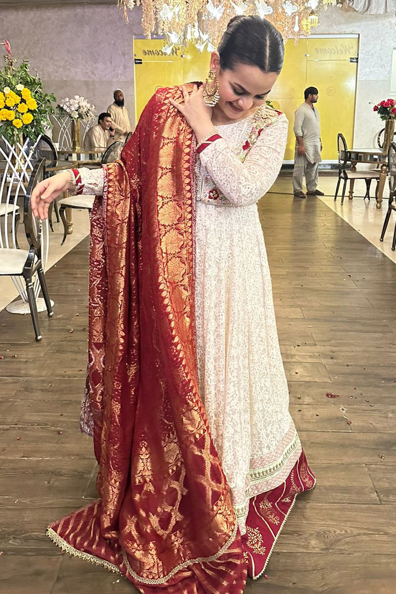 Long and flared silhouette sand beige angharka pishwas with subtle embroidered details that are enhanced with dabka and single thread embroidered details. The net pishwas is adorned with sequins and pearls on the front and back which is finished with hand block-printed border. The net dupatta with details incorporated with sequins completes the look. The pishwas is paired with straight silk pants.