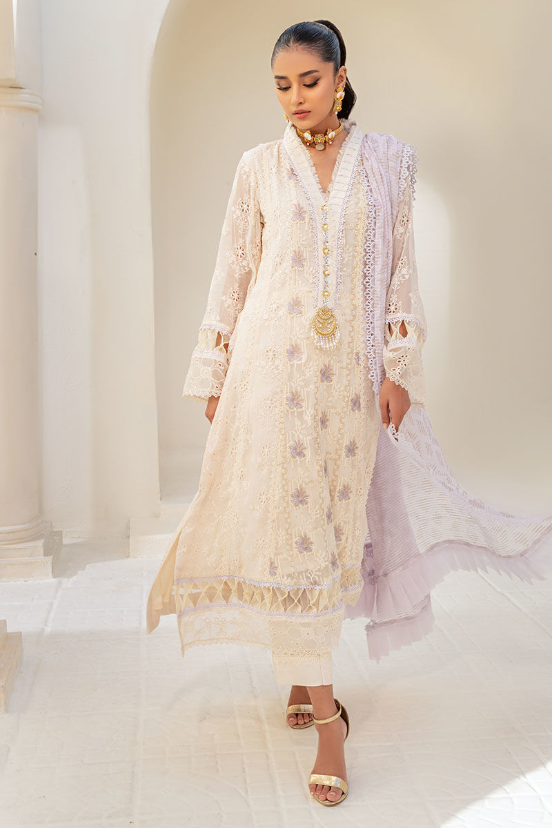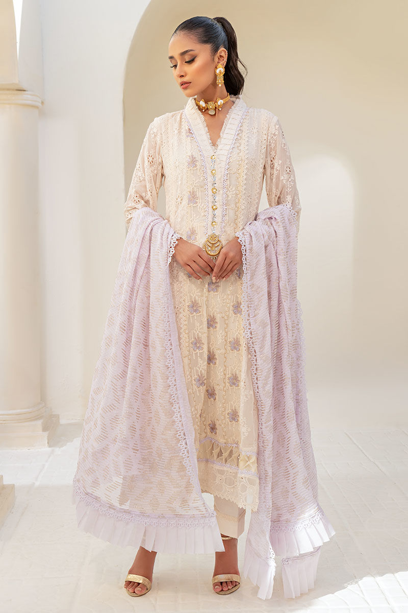 Roha epitomizes timeless elegance with its A-line solid beige-colored shirt crafted from schiffli chiffon. The embellished neckline and hemline add sophistication, while the embroidered chiffon dupatta with lace trimmings exudes traditional charm. This ensemble strikes the perfect balance between modern style and classic aesthetics