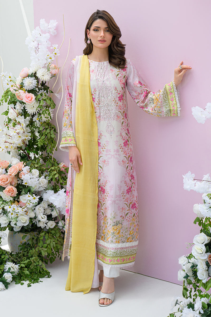 Embrace timeless elegance with Rose Reverie. This ensemble features an ivory and pink digital-printed long shirt, adorned with an embellished neckline and delicate floral accents. Intricate embroidery and lace detailing grace the sleeves, adding a touch of sophistication. Paired with cotton silk straight pants and a gradient cotton silk dupatta, this outfit exudes refined charm and graceful allure. The max length for this shirt is 45 - 46 inches