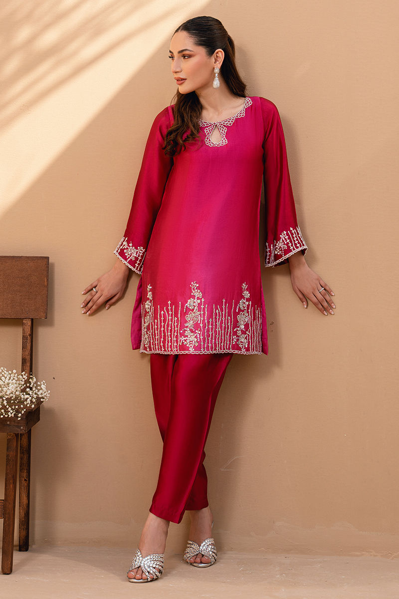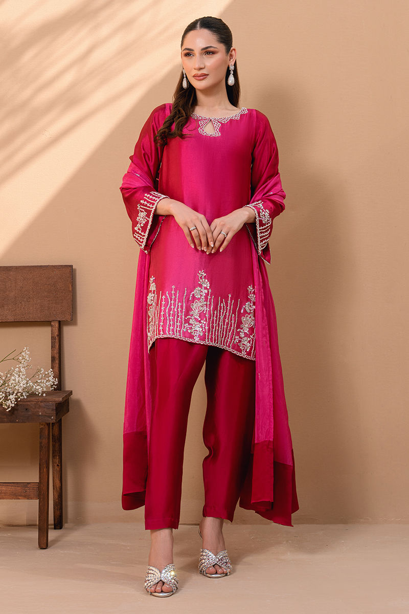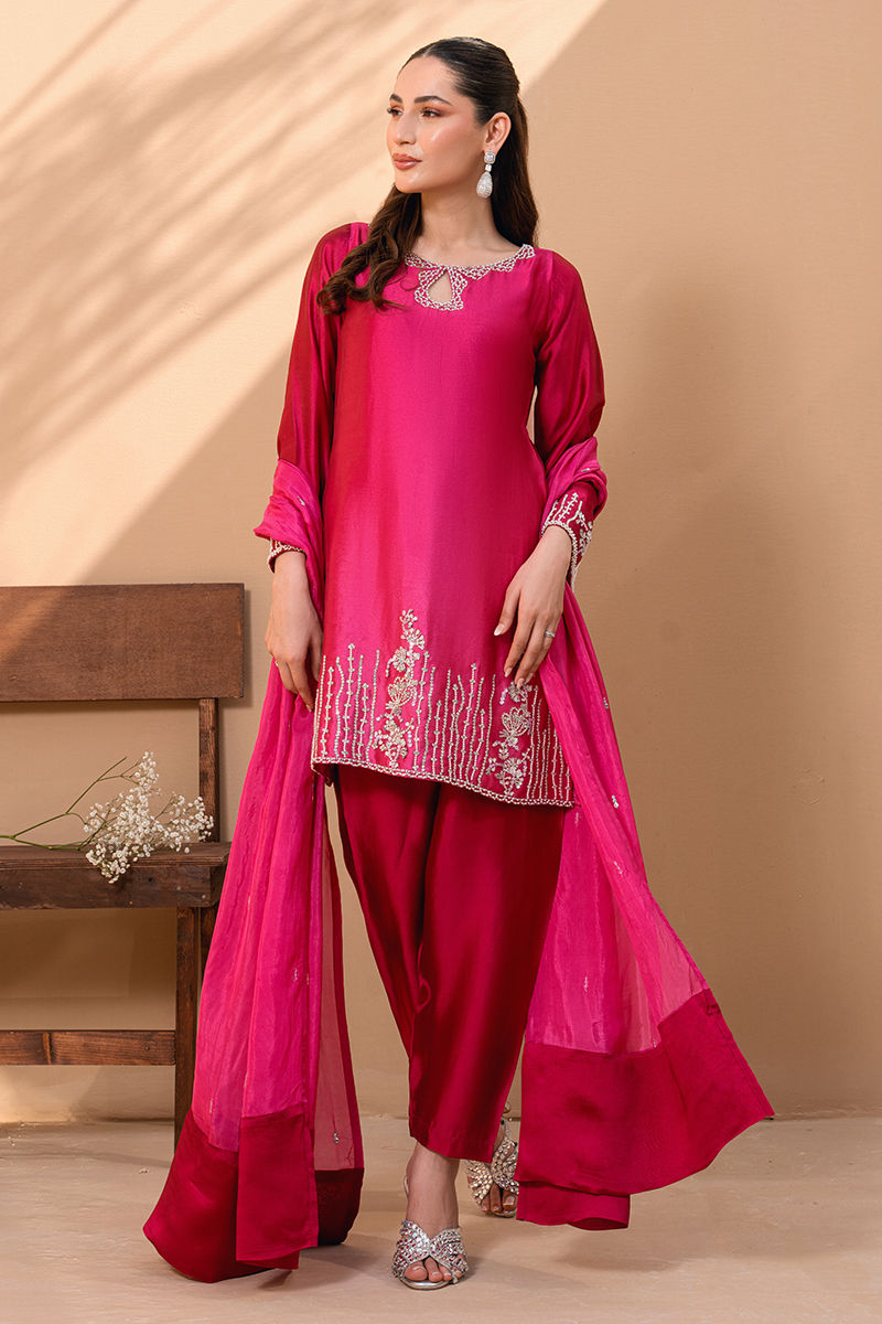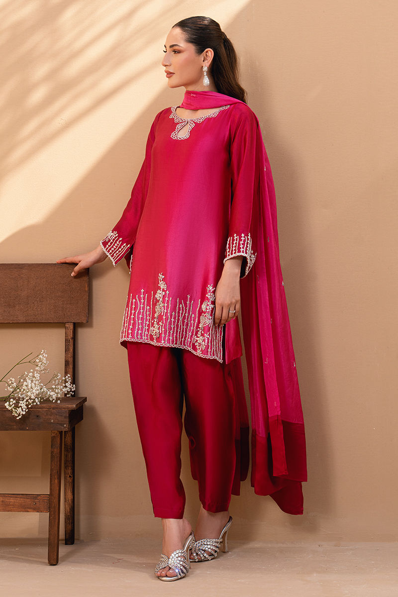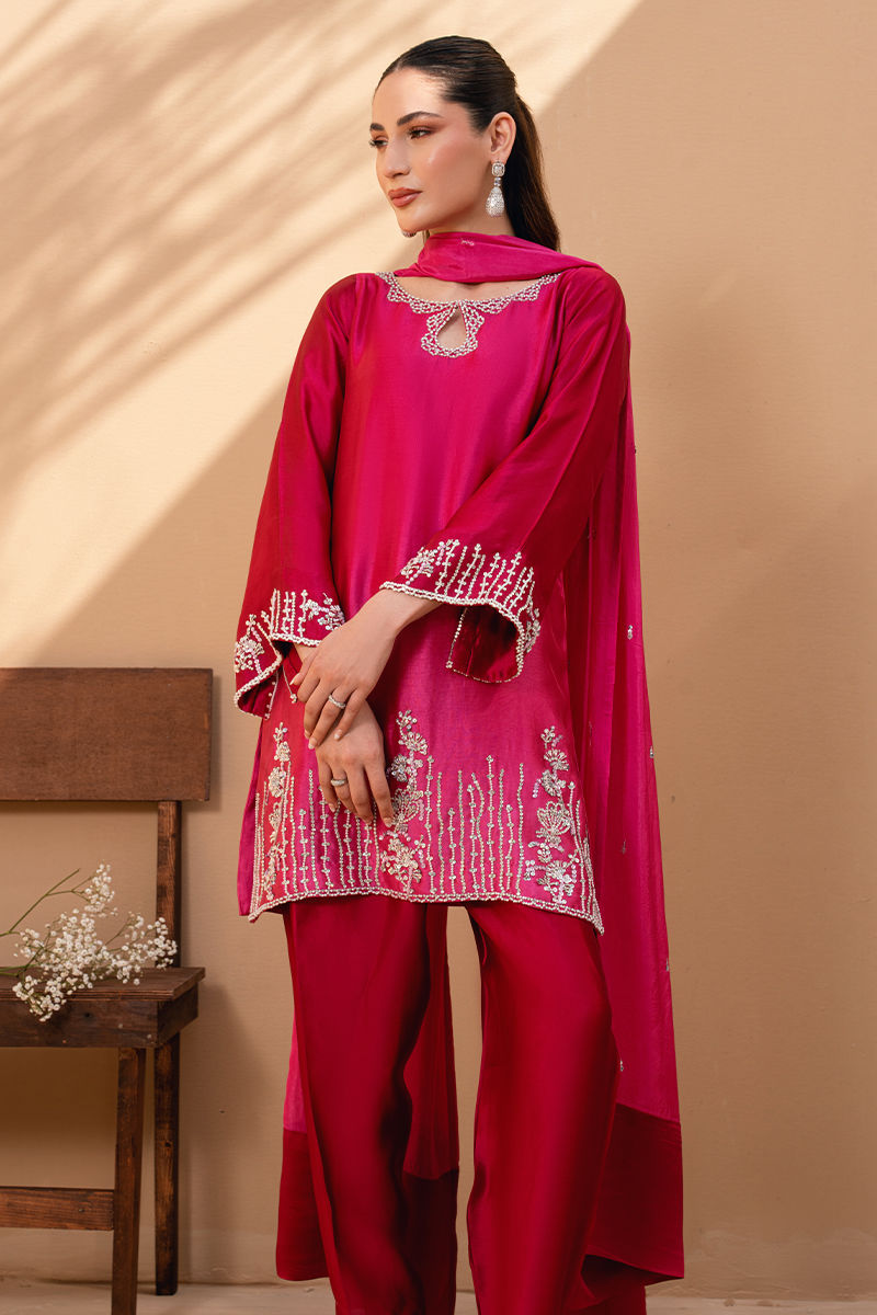 A timeless silhouette rendered in a rich berry hue, this three-piece ensemble is the epitome of understated elegance. The straight-cut shirt is adorned with delicate ivory thread embroidery along the hem and sleeves, complemented by a subtly embellished neckline that adds just the right hint of sophistication. The relaxed-fit trousers balance comfort with polish, while the sheer dupatta, finished with a tonal border, lends a soft, graceful movement to the look